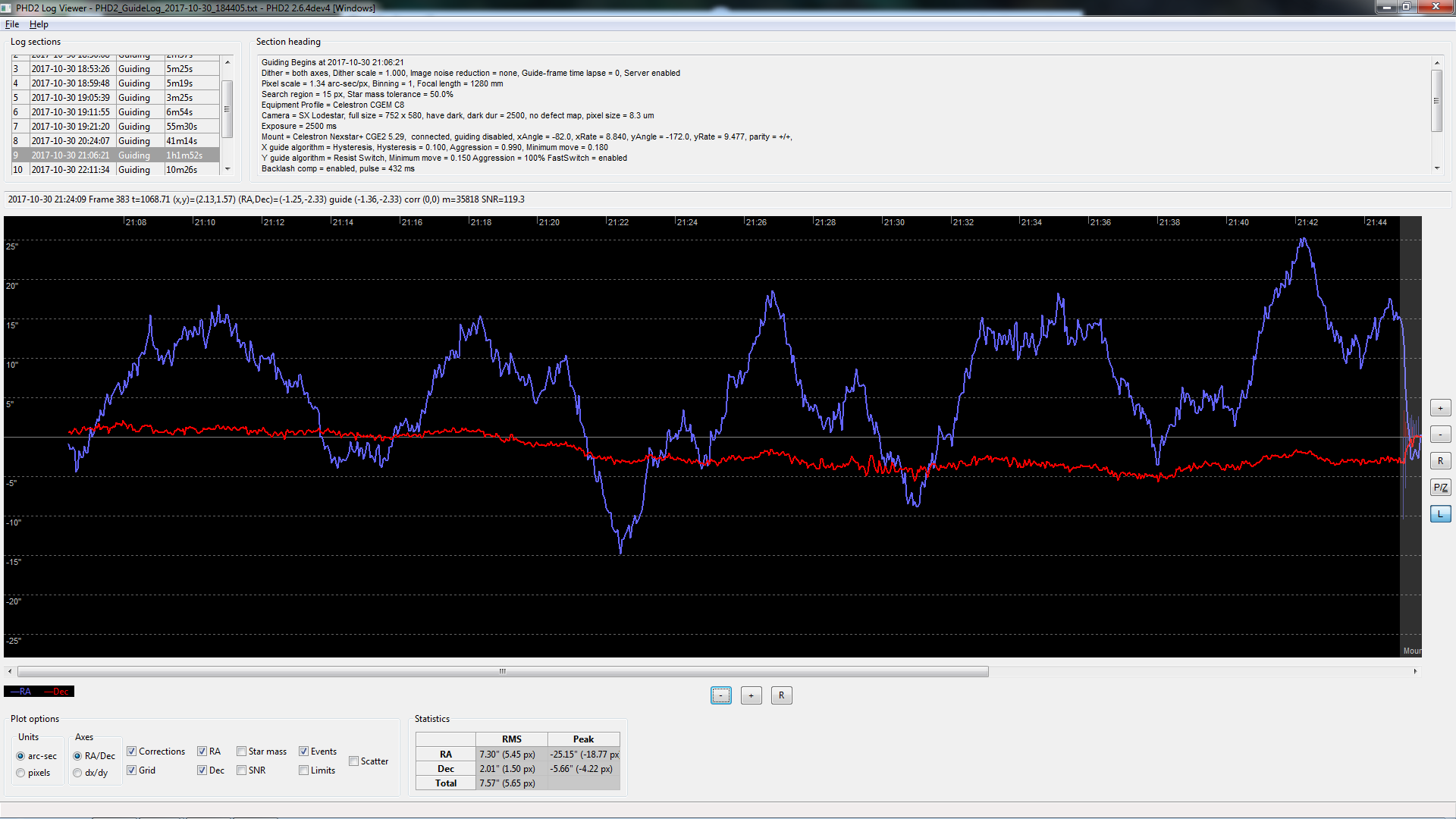 RMS i exemplet ovan, för DEC är 2.01” och för RA 7.30” oguidat. Som jag skrev, guidat kommer jag ner mot en RMS på 1,5-2,0 i RA medan den peakar +/- 4-5 arc-sec. RMS tot. hamnar runt 1,50 - 2,00 pga av den yviga RA:n medan endast DEC ligger runt 0,50 guidat.