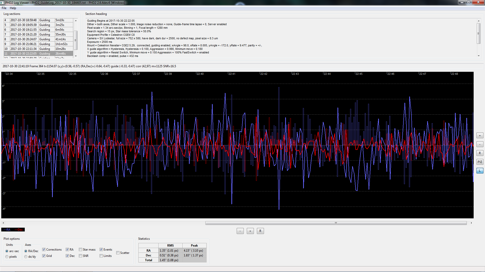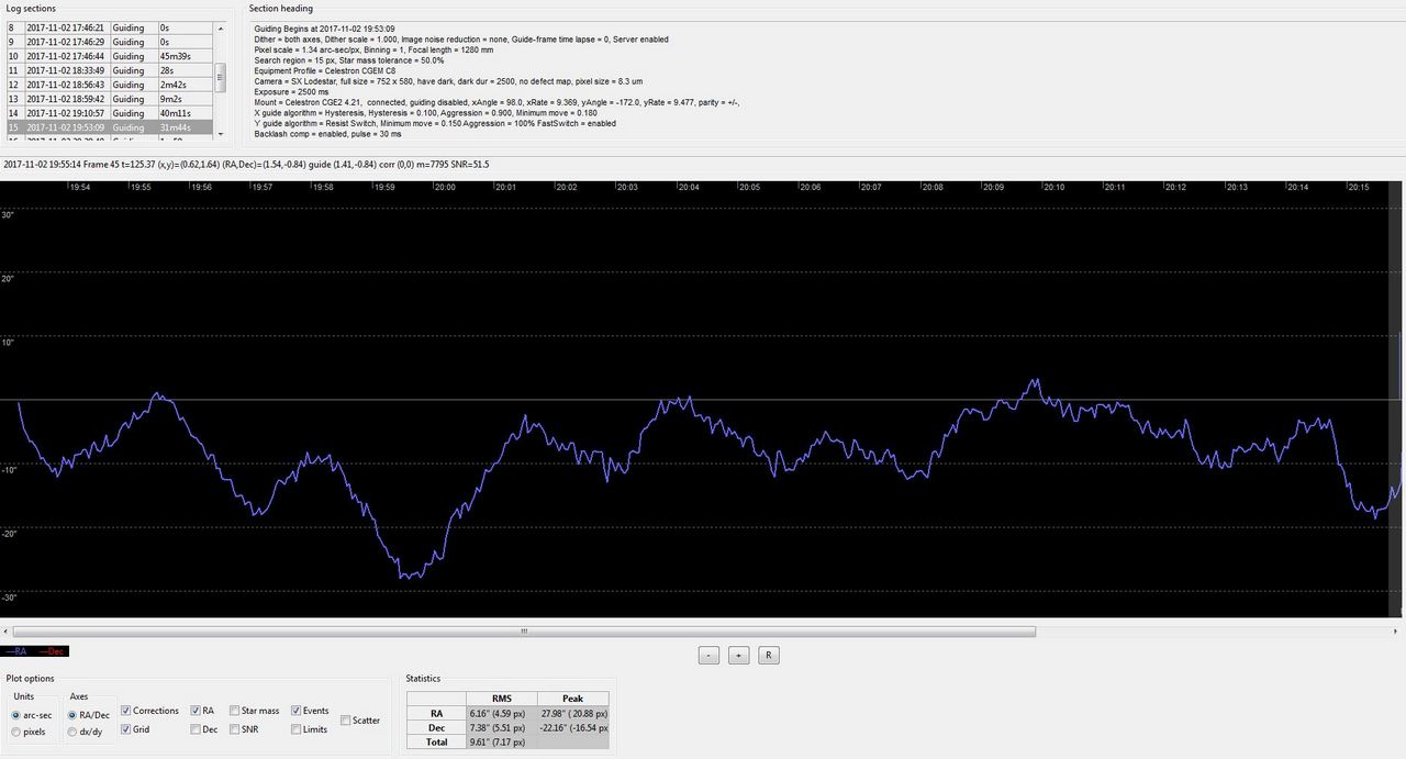 Bilden i inlägget 17:54 ovan visar hur det brukar se ut under guidning med yviga rörelser i RA som där ger en RMS på 1.35” medan DEC ligger på mer beskedliga 0.51” Igår såg det ut såhär med RMS 1.53” respektive 0.57” Allt utan PEC: