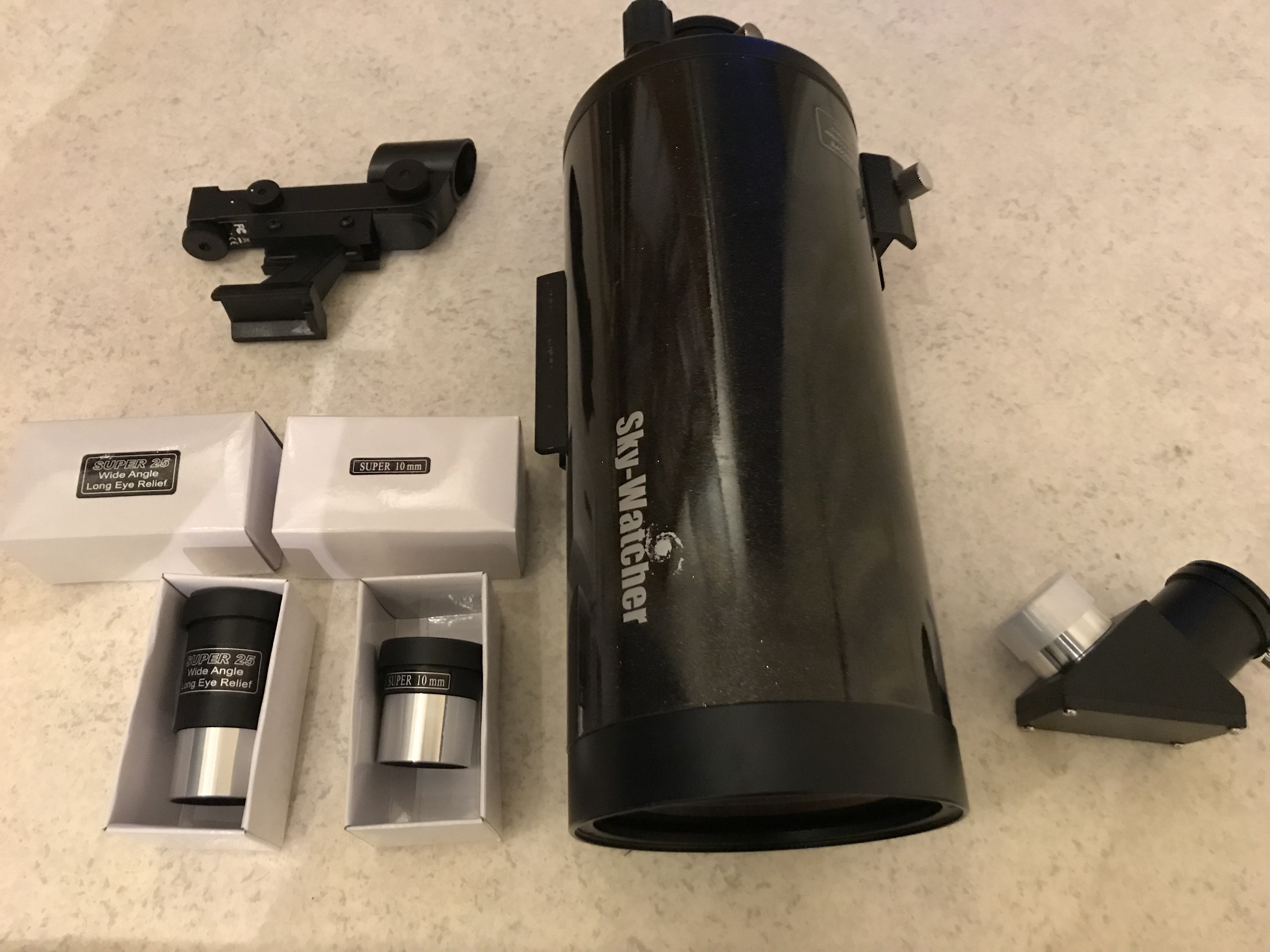 Kommer med utrustning som följde med inköpet: väska, rödpunktsökare, 1.25” diagonal och två passande okularer av enklare modell (10 och 25 mm). Allt är i bra skick. Finns i Stockholm, kan skicka med posten i originalemballage.