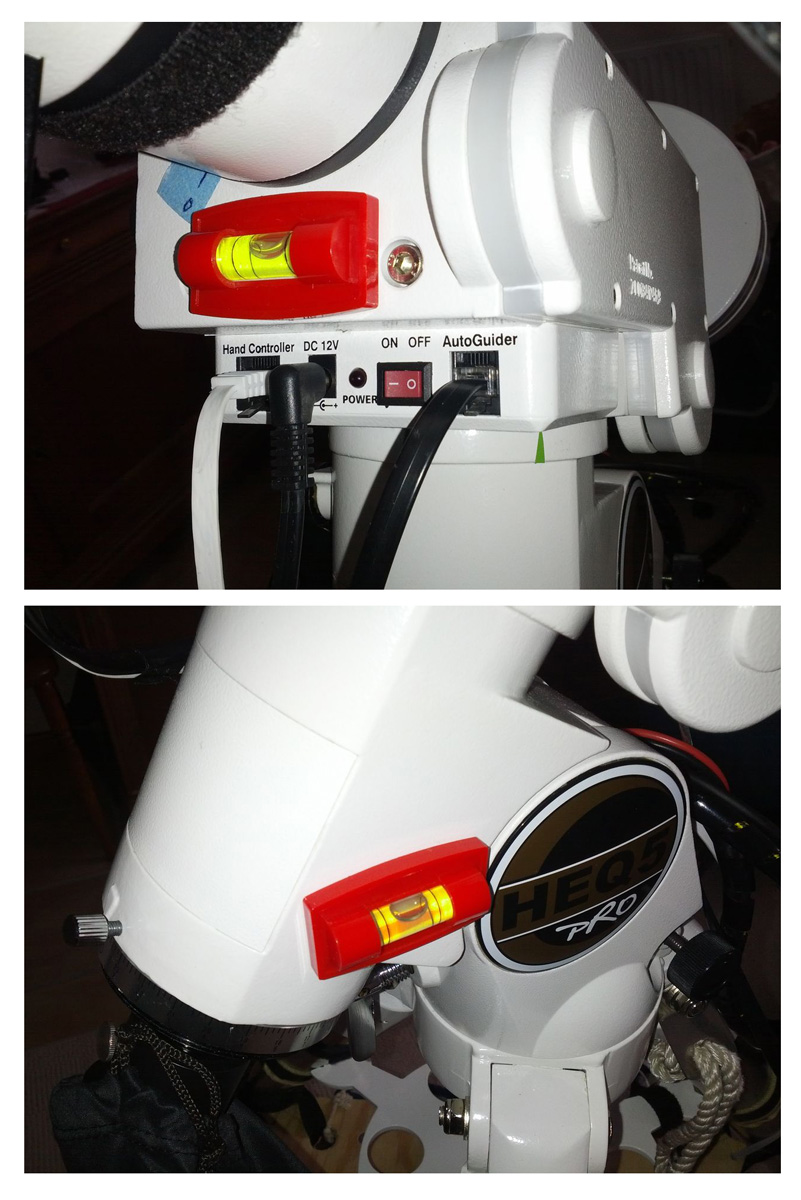 Men ett annat problem, polinställningen eller rättare sagt inställning av montering i vågrätt plan innan polsjustering. Jag ser måhända lite dåligt men jag kan inte hitta något inbyggt vattenpass i AVX. Polinställning är ju meningslös om inte monteringen står i våg. Jag prövade med vattenpass på tillbehörsplattan men det visar sig att den hamnar i lite olika plan så jag får använda vattenpasset direkt på stativringen, d.v.s. utan monteringshuvudet påsatt. Det medför i sin tur att jag måste få stativet med "kingpinnen" på ringen som riktmärke tillräckligt bra i nord-syd för att senare kunna justera inom räckvidden för azimutjusteringen på monteringen. Inte så enkelt när det är mörkt att hitta bra syftlinje. Jag får sedan till en hyfsad polinställning men det känns lite knasigt att behöva använda vattenpass.