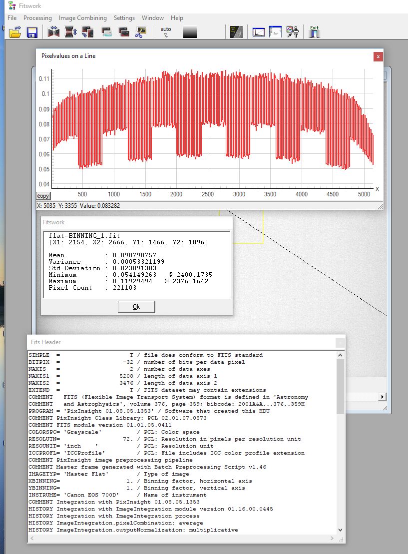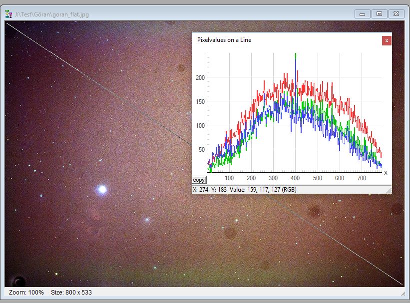 Jag har med verktyget Fitswork gjort en enkel analys om signal nivåerna i bilden, den mäter efter det diagonala strecket jag dragit. Mot hörnorna har du nästan ingen signal alls. Tyder på att du har en enorm vinjettering i optiken där. Visserligen kan man med noggrant gjorda flats få upp nivån där till samma nivå som i centrum. Men då ökar ju också bruset kraftigt i de yttre delarna. Nu har du visserligen manipulerat i bilden och det gör nog att det ser värre ut än det är. Om du gör samma analys på din kalibrerade masterflat eller en sub flat med subtraherad bias så får du direkt hur mycket optiken vinjetterar och också en bedömning om det är något fel i din flats.