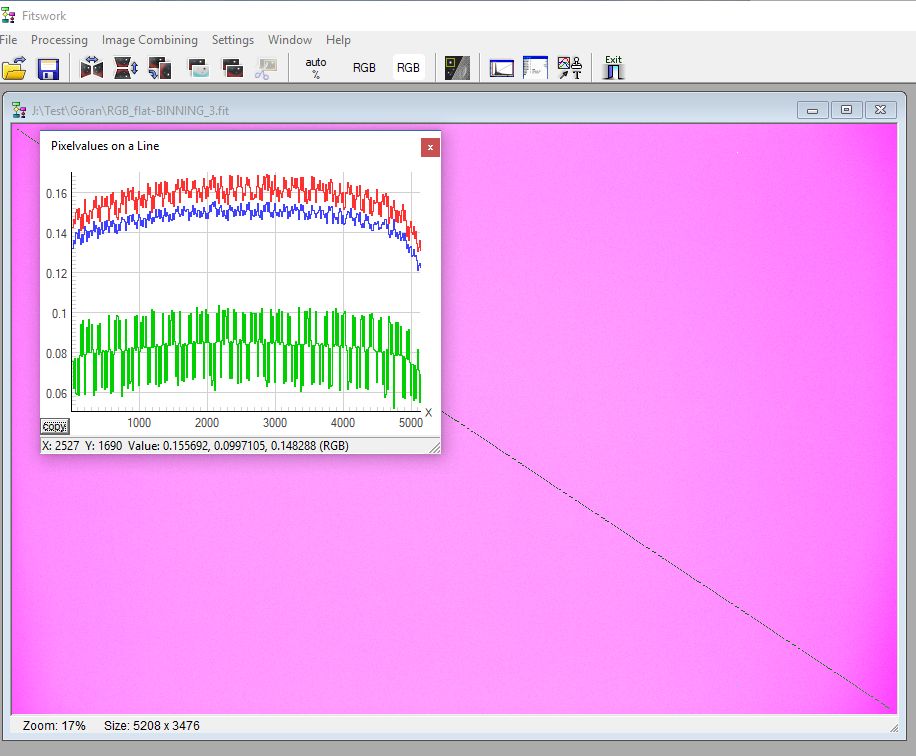 Här är raw bilden i sitt ursprungliga CFA format. Man ser tydligt redan här att de olika färgkanalerna ligger på olika nivåer och varav en lite väl lågt. Halva max signalen efter biasen dragits bort kan vara en bra utgångspunkt och då mäter man i den centrala delen. 14-bit har som max 16000 ADU och med Bias på 2048 bortdraget blir det 14000 ADU kvar, så runt 7000 ADU kan kanske vara bra, inte högre för där blir gärna sensorn olinjär och inte för lågt då det ger onödigt brus. Som du ser har Fitswork dragit av 2048 motsvarande biasen automatiskt, bra för då slipper man tillföra utläsningsbrus från biasen. Kräver lite kvalite av kameran så det inte är för ojämn nivå. Dithering fixar ev statiskt mönster vid stackning. Du måste dra ut linjen över hela diagonalen, antagligen tog du bara en kort sträcka.