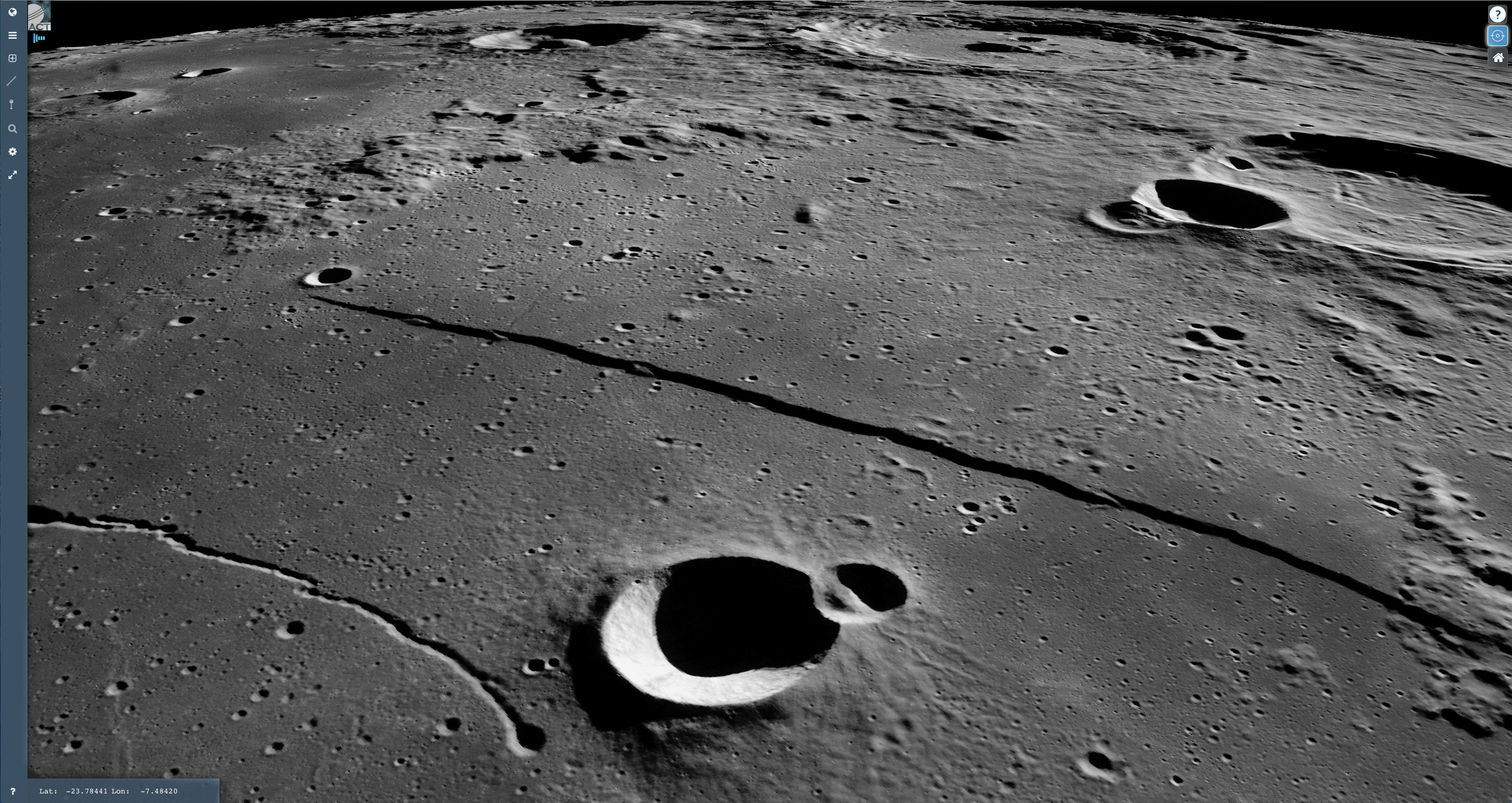 Jag är inte så ofta ute på http://quickmap.lroc.asu.edu" onclick="window.open(this.href);return false; när jag inte aktivt studerar månen men jag upptäckte ett häftigt nytt verktyg som visualiserar månen i virtuell 3D projektion med möjlighet att flyga runt ett område för att studera det ur alla vinklar
