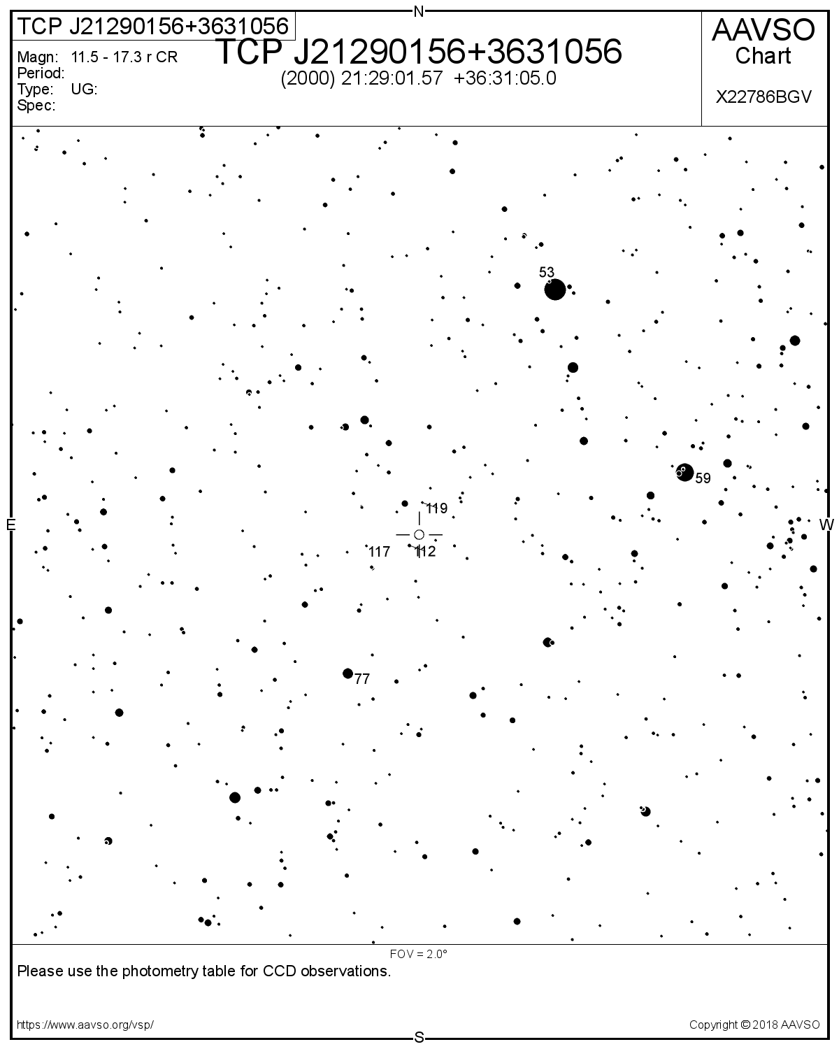 Magnitudsekvens finns redan nu på AAVSO VSP. Kartorna nedan har utsnitt 8x8 grader, 2x2 grader, 30x30 bågminuter och 10x10 bågminuter. Norr är uppåt.