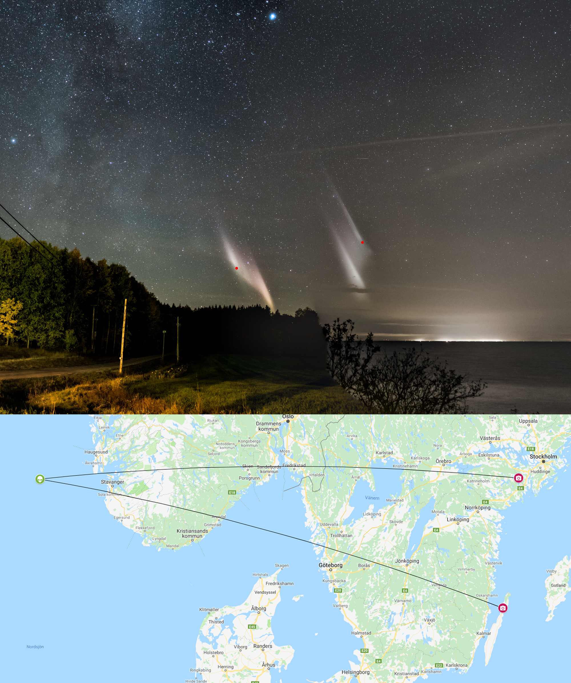 Jag har räknat ut avstånd och höjd till en meteor, NLC, norrsken och en asteroid med hjälp av bilder tagna samtidigt från 2 olika platser och Paul Schlytters online kalkylator http://stjarnhimlen.se/calc/metnlcalt_en.html" onclick="window.open(this.href);return false; .