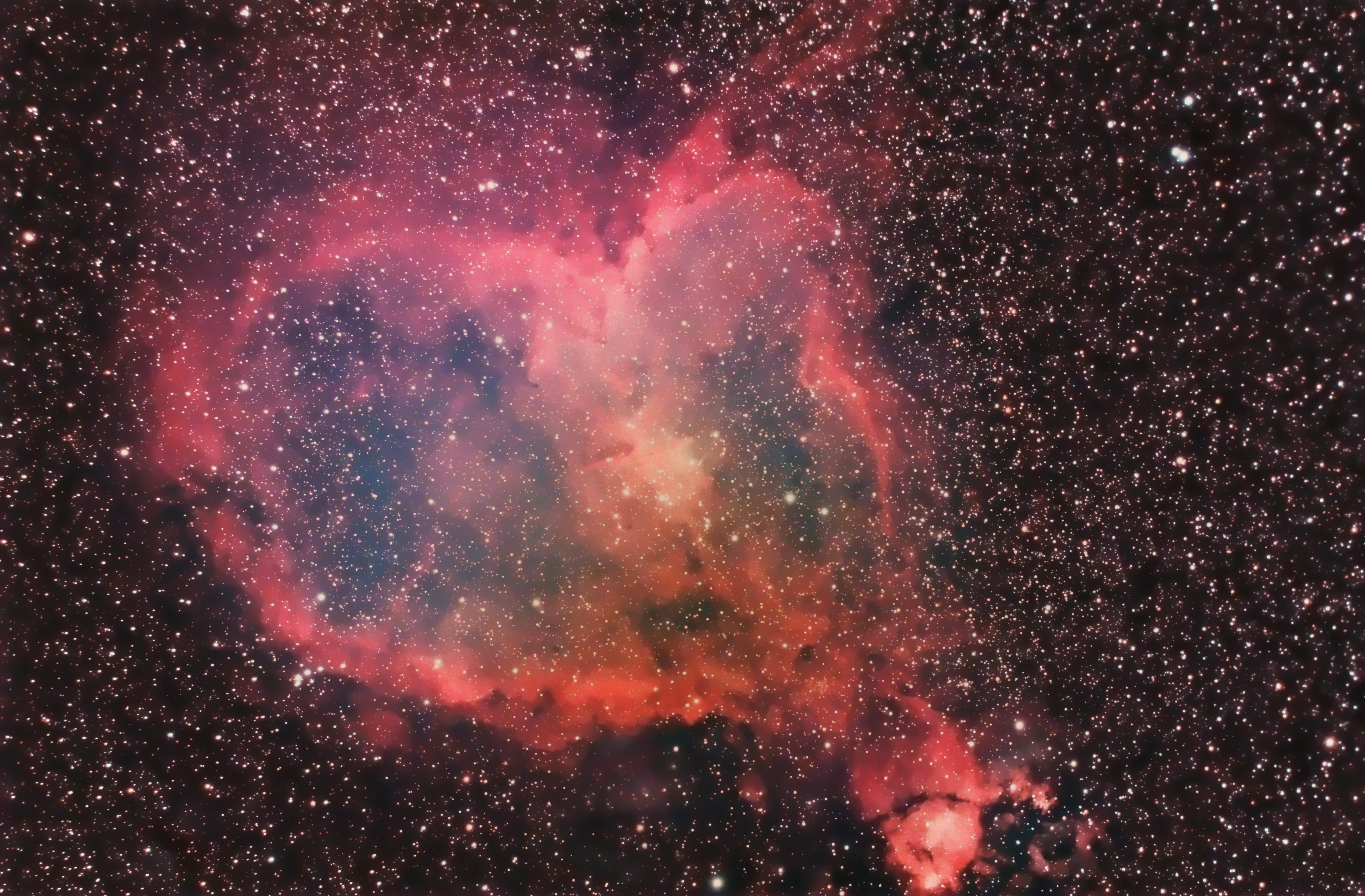 Heart Nebula, IC 1805 ligger cirka 7500 ljusår från Jorden och ligger i galaxens Perseus Armé i konstellationen Cassiopeia. Det upptäcktes av William Herschel den 3 november 1787. Det här är en emissionsnebula som visar glödande joniserad vätgas och mörkare dammbanor.