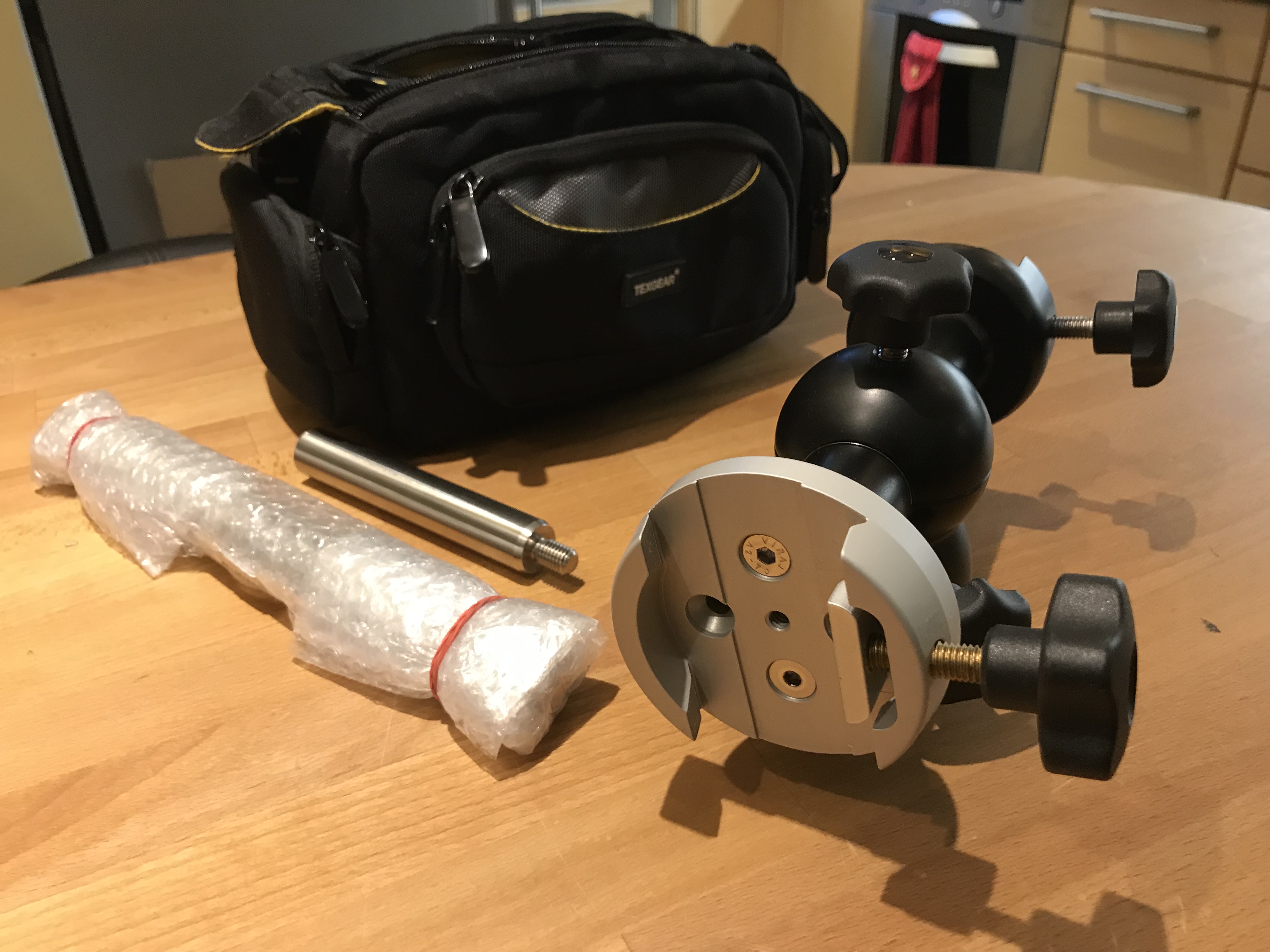 Berlebach Alt Azimutal huvud helt metall. 2st motviktstänger av olika längd samt 2st vixenklämmor för dubbelmontage av teleskop. Motviktstängerna kan monteras istället för vixenklämman på någon av sidorna vi montering av tyngre teleskop. 3/8 gänga för montering på större kamera stativ. Mycket bra skick