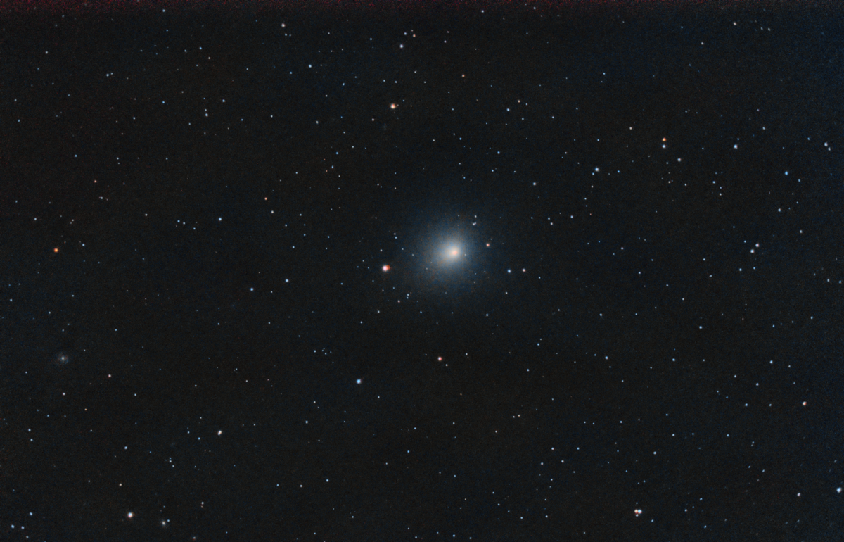 Kommentar: Mitt första försök på en komet. Mycket pillande för att eliminera stjärnspåren, och kometen är svag i koman, så det blir brusigt hur jag än gör - kanske vad min 1000D klarar av under mina förhållanden. Tanken var att ta ytterligare en 100 subs medan jag sov, men efter 2 subs frågade datorn efter input som den så fick på morgonen efter.... så det fick bli de här 48. Den röda blobben vid stjärnan i centrum ser ut att vara en reflex, om jag förstår rätt, och är en helt ny effekt för min del. Taget med Ekos/Indi och helt processat i PixInsight.