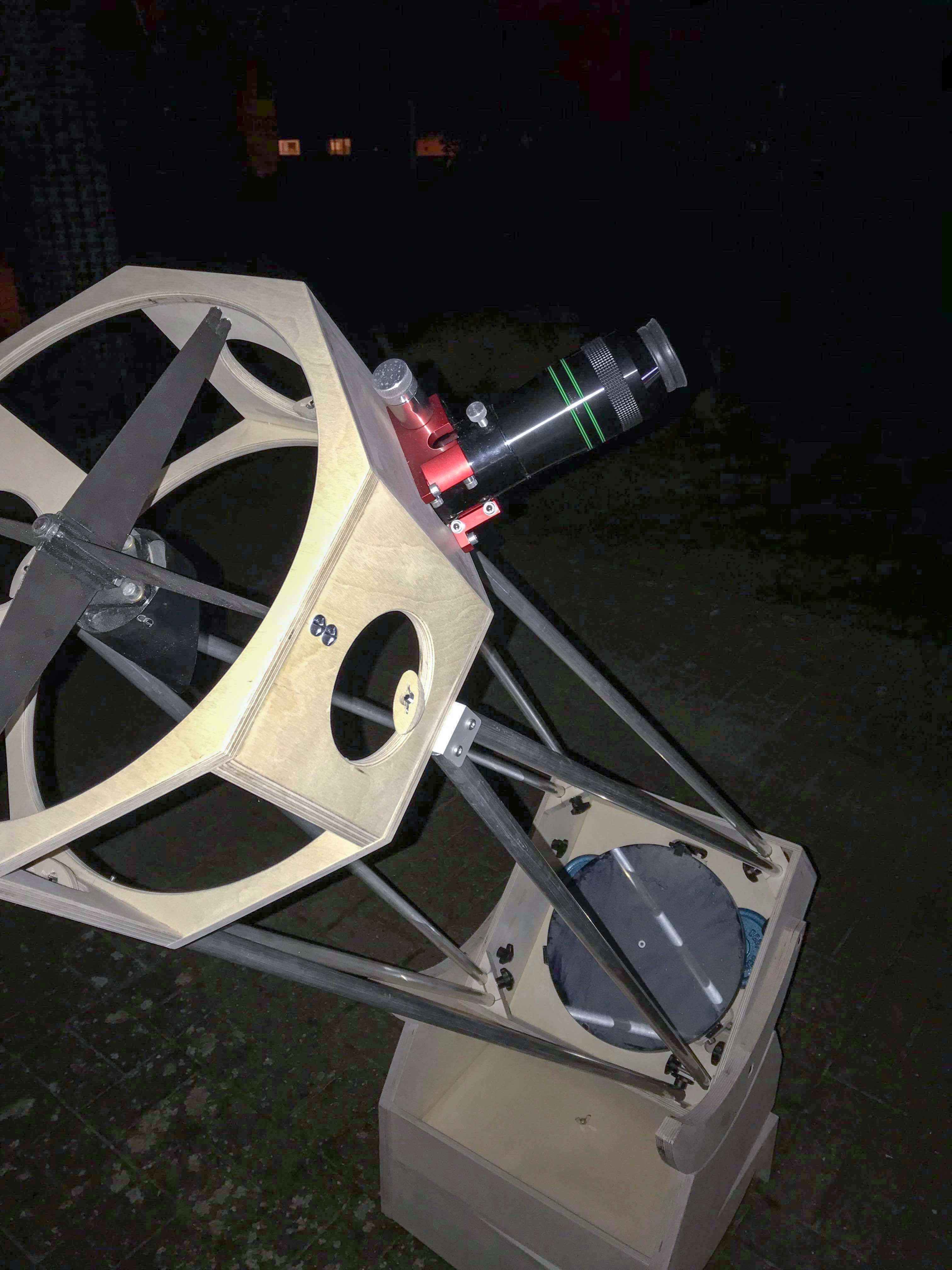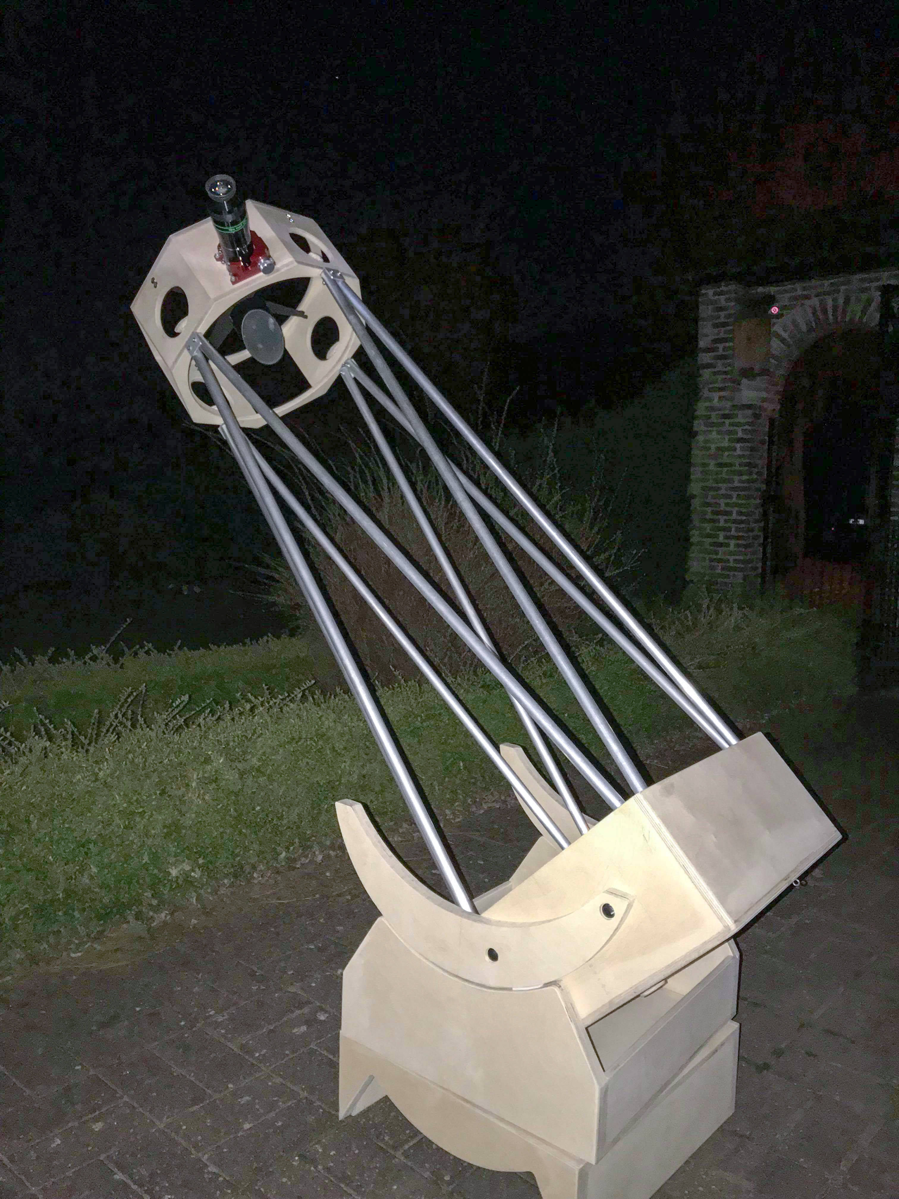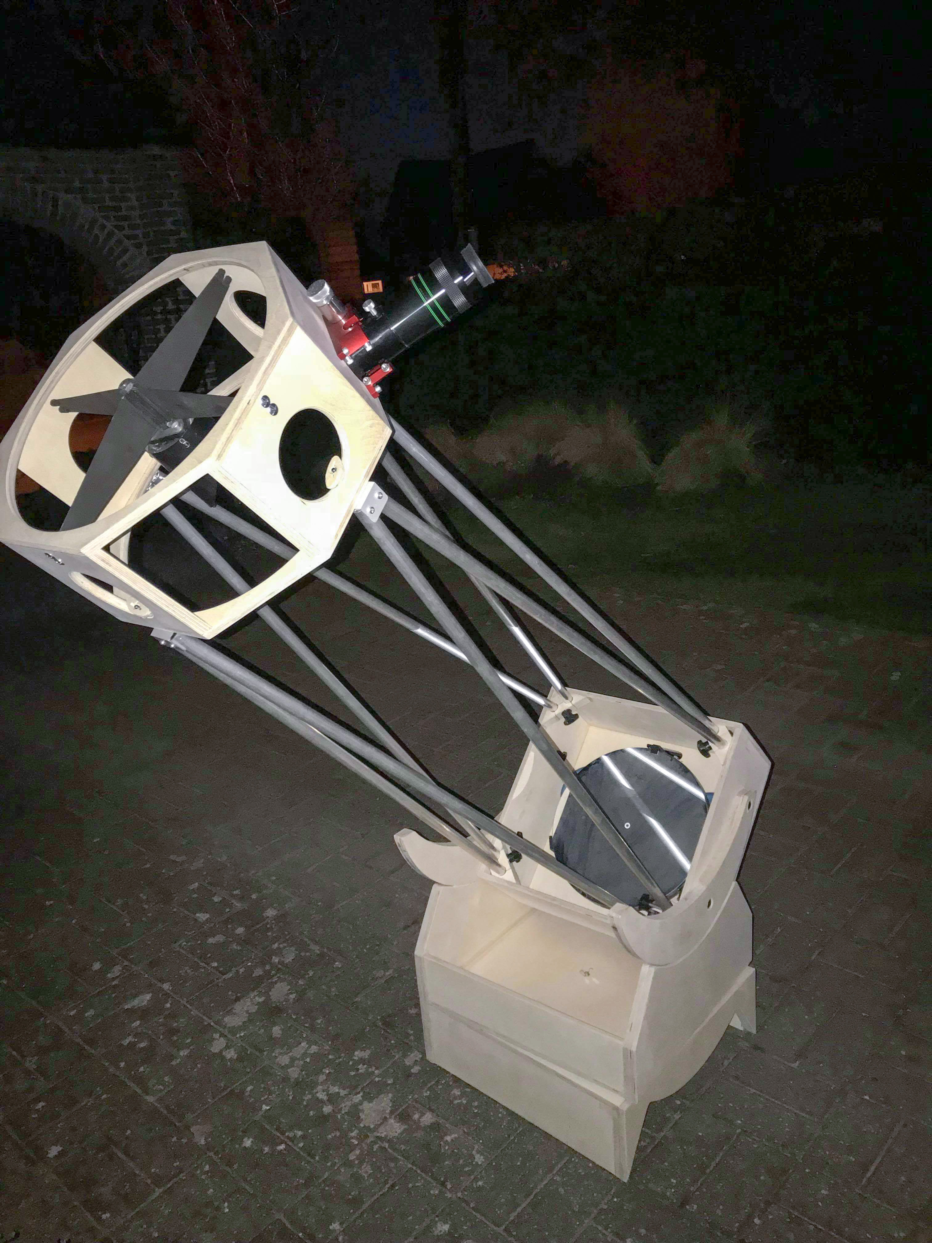 Grunden var att det fasta Dobson teleskopet var 2 meter högt och en halv meter bred, och säkert 50 kg tungt .... Efter ombyggandet till ett Truss Dodson blev det ett bärbart låda på cirka 40 x 40 cm och + 25 kg plus 4 par aluminiumspärrar på 130 cm