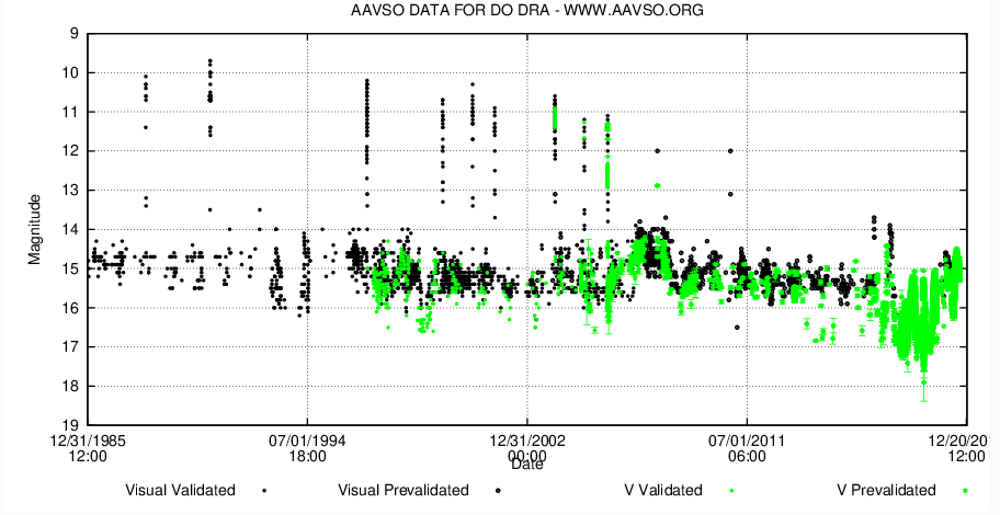 Det slog mig nu, att jag inte hört talas om några utbrott för DO Dra på länge. Och ja, det har verkligen gått lång tid sedan den syntes ljusstark. Se diagram med visuella observationer och V-mätningar nedan.