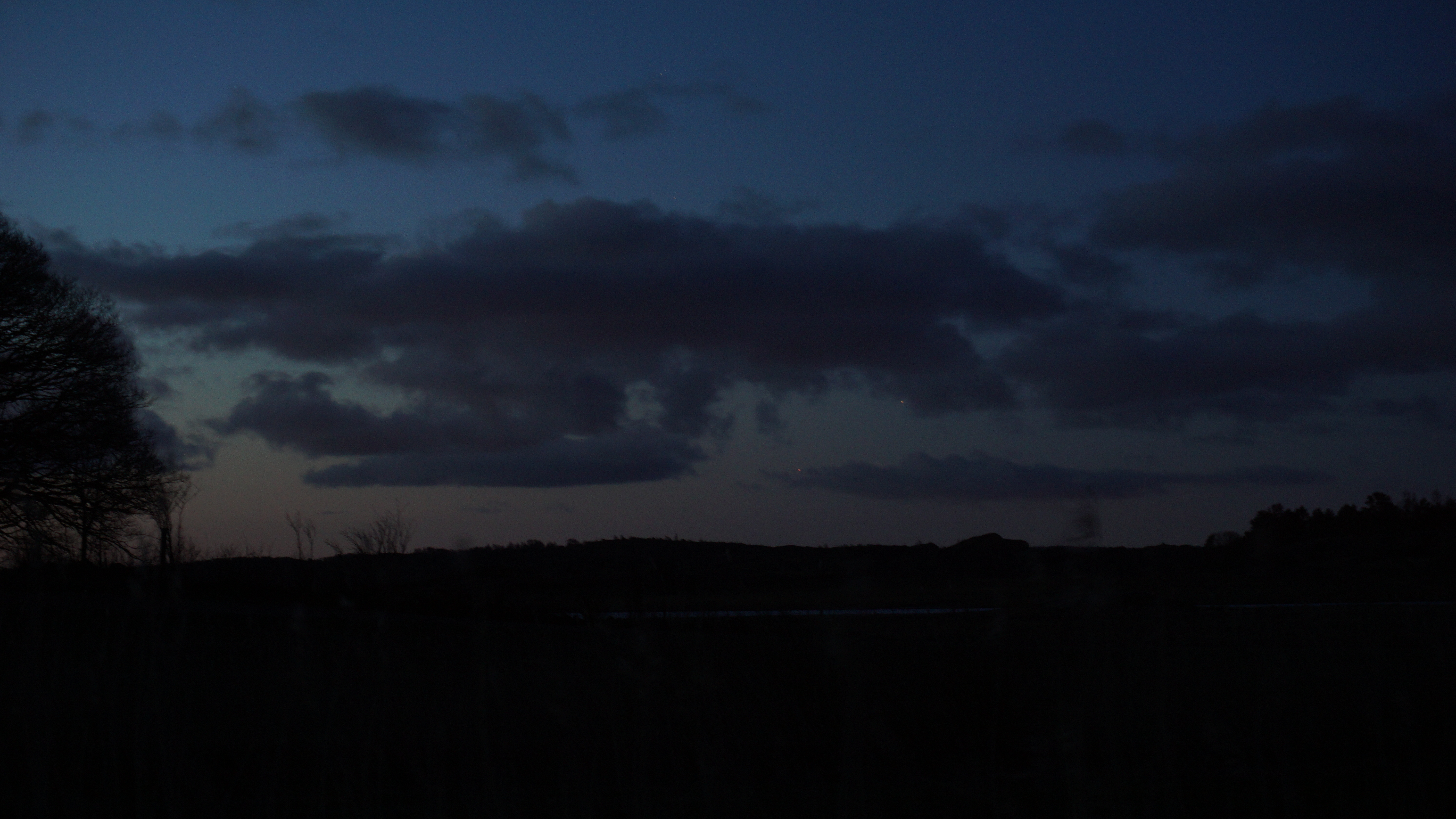 @ jwarell Det var lite småknepigt, dessutom så dök det upp en molnbank vid bästa fototiden. Hade inte det hänt hade jag fått en bättre bild. Se på den här bilden: Man ser Saturnus och Mars betydligt bättre men Jupiter skyms av molnen. En annan bild visar hur det såg ut senare. Man kan skymta Saturnus och Mars på den ljusa himlen där med.
