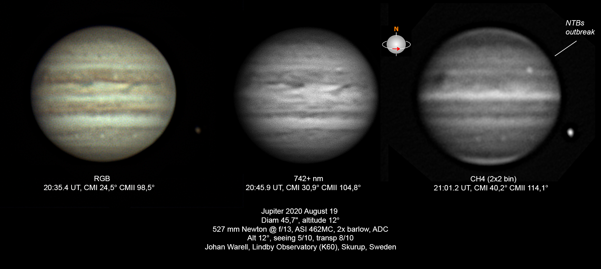 Kommentar: En metanbandsbild av Jupiter, stack av ca 1800 exponeringar i CH4-filter, vardera 10 ms ur en 120 sek sekvens, waveletfiltrerad i Registax. Jupiters höjd var 12 grader, seeingen 3/10 med snabba böljande vågor över skivan.