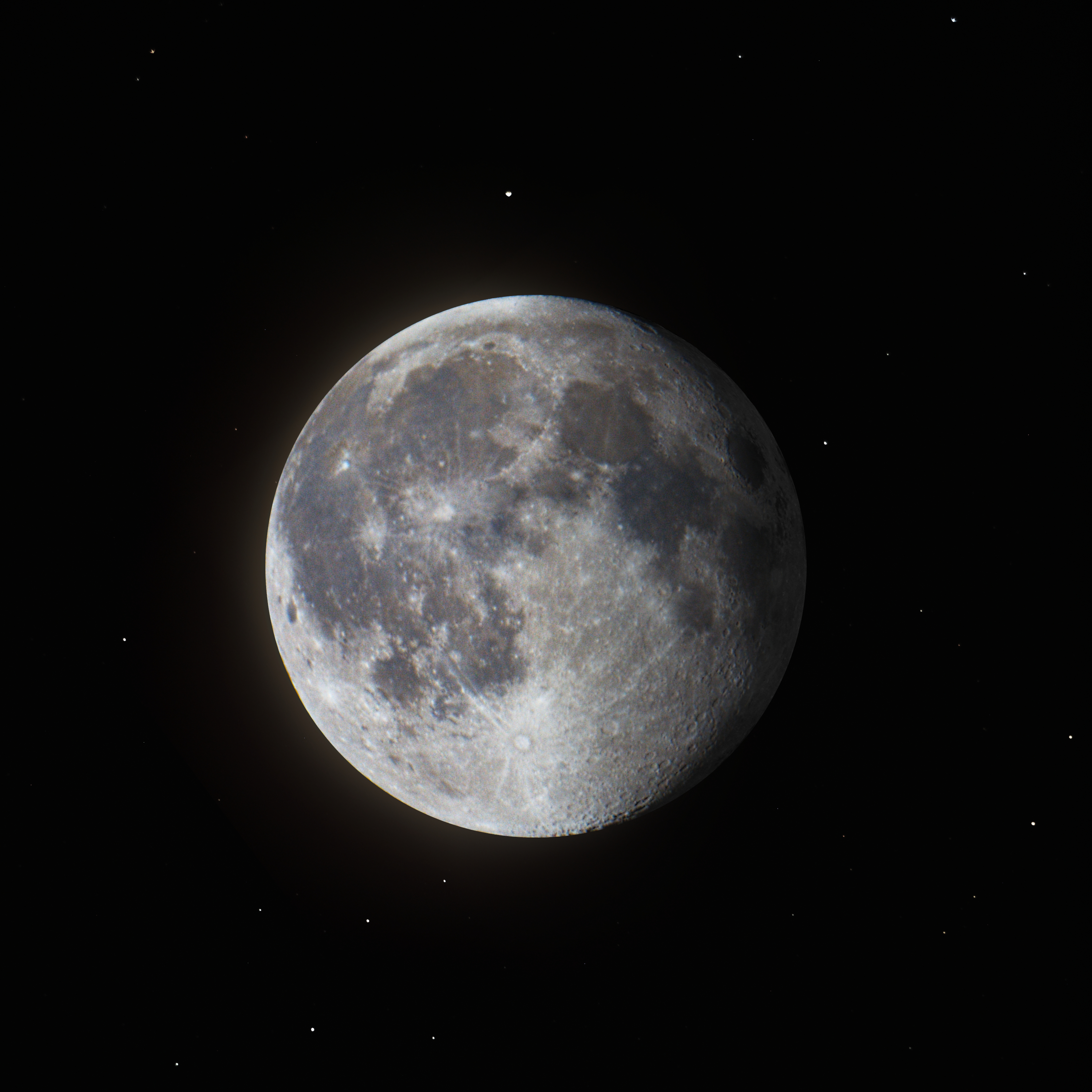 Detaljer och balanser på ljusa sidan av månen gjordes i Pixinsight och all uppblandning av bilderna gjordes i GIMP.