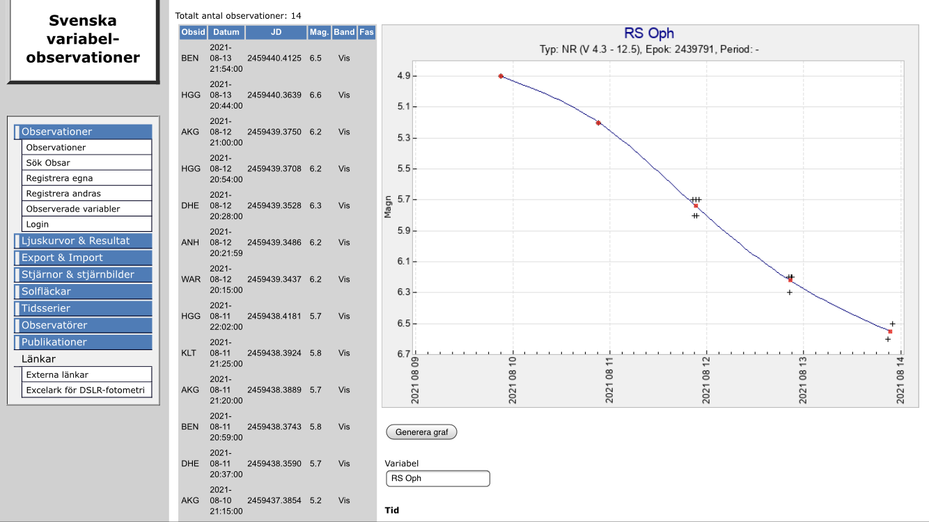 Kommentar: Den återkommande (recurrent) novan RS Oph har nu en magnitud runt 5. Det är den starka stjärnan mitt i bildens undre del, c:a en fjärdedel upp från underkanten. Zoomen på 200 mm, ingen följning.