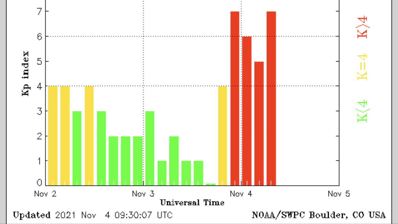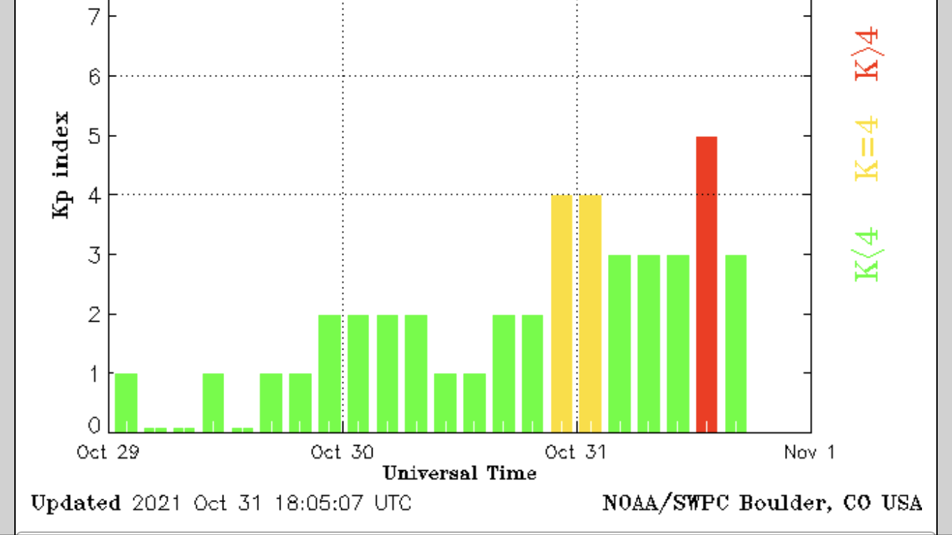 Nu (klockan 17 svensk normaltid) har Kp-indexet hastigt gått upp till 5, geomagnetisk storm.