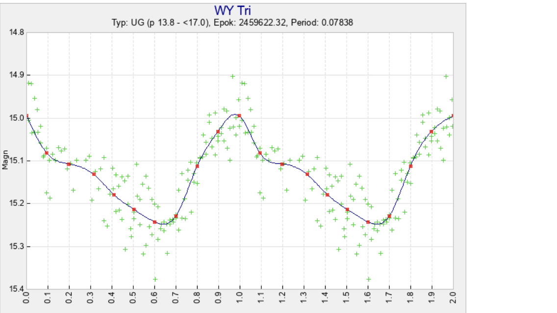 Det slår mig nu att den platå som i ditt diagram finns på avtagande kurvdelen hos WY Tri nog är just en ”orbital hump” i Holliers mening. Den borde i så fall förflyttas en smula i fasdiagrammet för varje nytt omlopp, och ge upphov till en sekundär topp i ett periodogram.