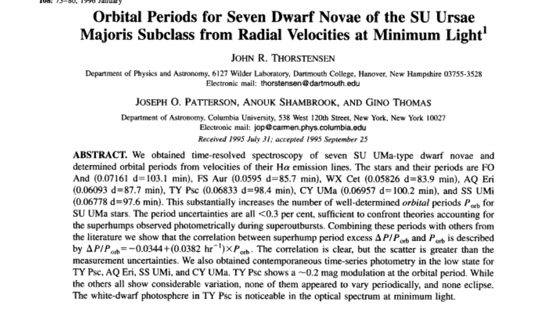 Nåväl, jag ser att jag glömde kommentera en undring du hade. Omloppstiden hos en SU UMa-stjärna kan bestämmas genom spektroskopi vid viloläget, men också ibland genom att man i periodogrammet får en sekundär topp (omloppstiden) strax intill primärtoppen (superpuckelperioden).