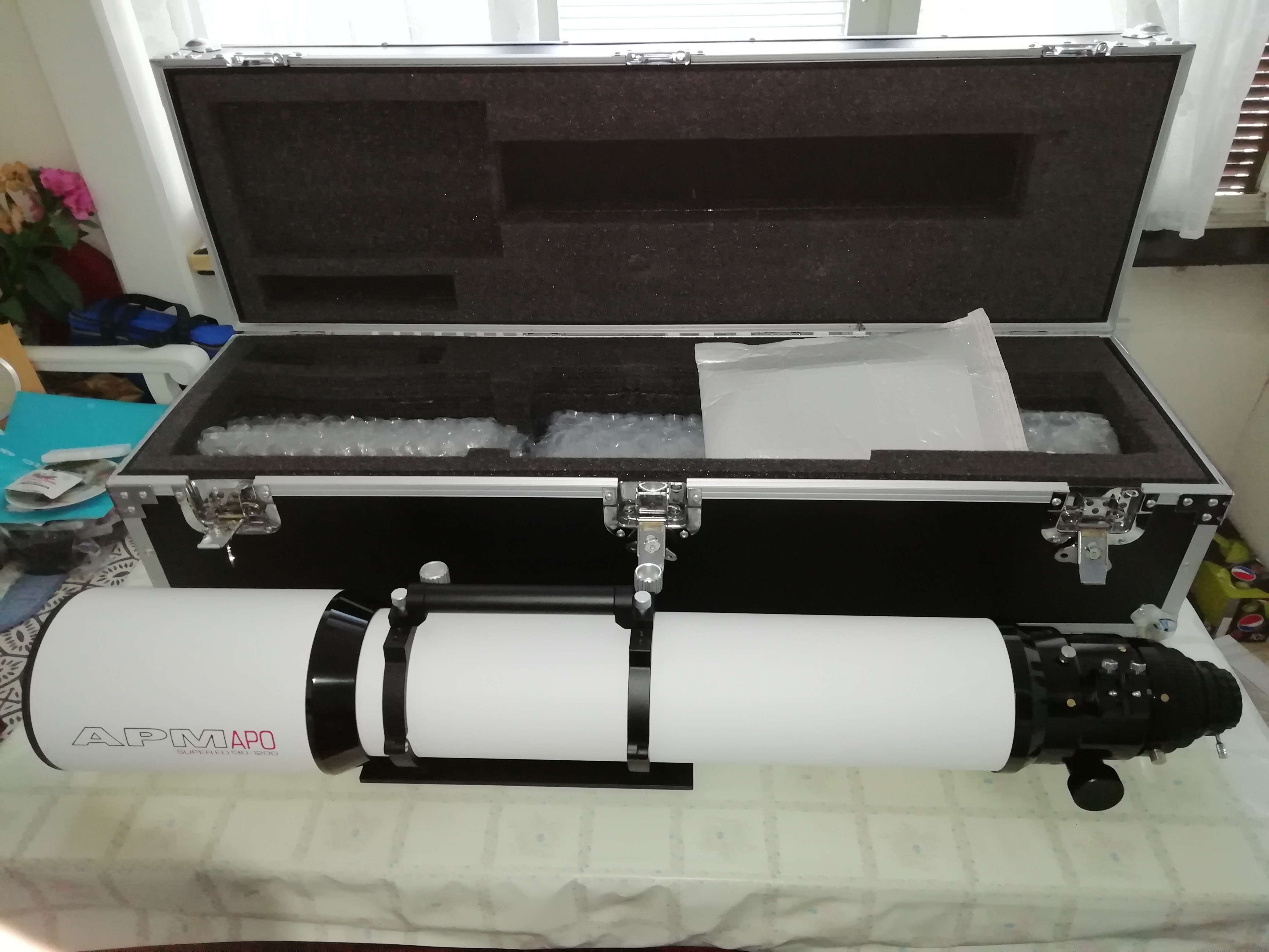 Nyskick, endast använd 4-5 ggr. Som mitt visningsnamn antyder så observerar jag mestadels från balkongen. Storleken underskattades och tyvärr är det överdimensionerat för min utrymmesbegränsade balkong. Optiken är den bästa jag observerat igenom, vid ett tillfälle när väderförhållandena var som bäst kunde månen observeras med 500x utan att bilden bröts ner. Teleskopet är diffraktionsbegränsat med en Strehl-garanti på 95%. Optiken är för hand bearbetad av LZOS på uppdrag av APM. 6 månaders garanti medgår från Tecknosky, ca.3 månader kvar.