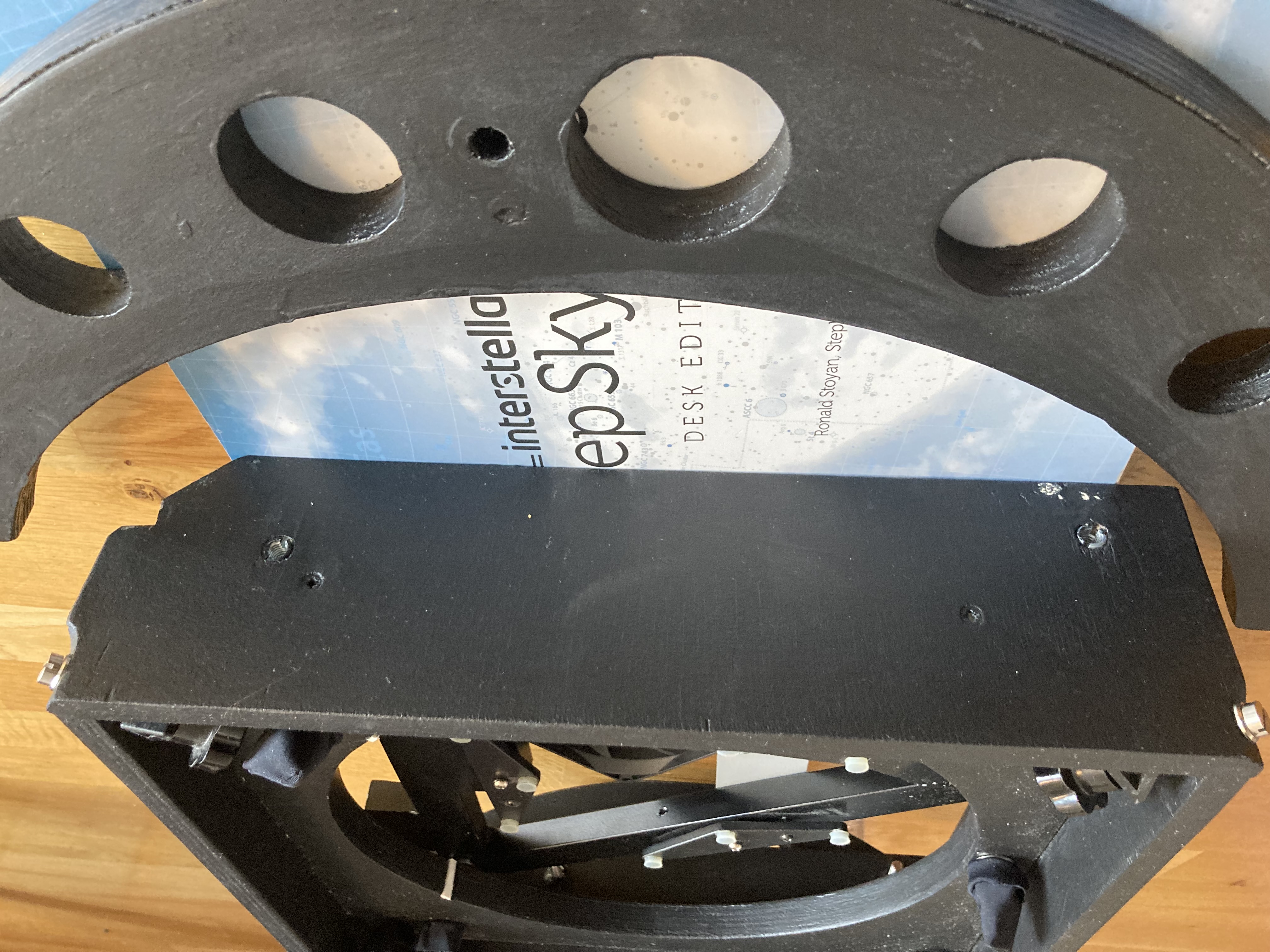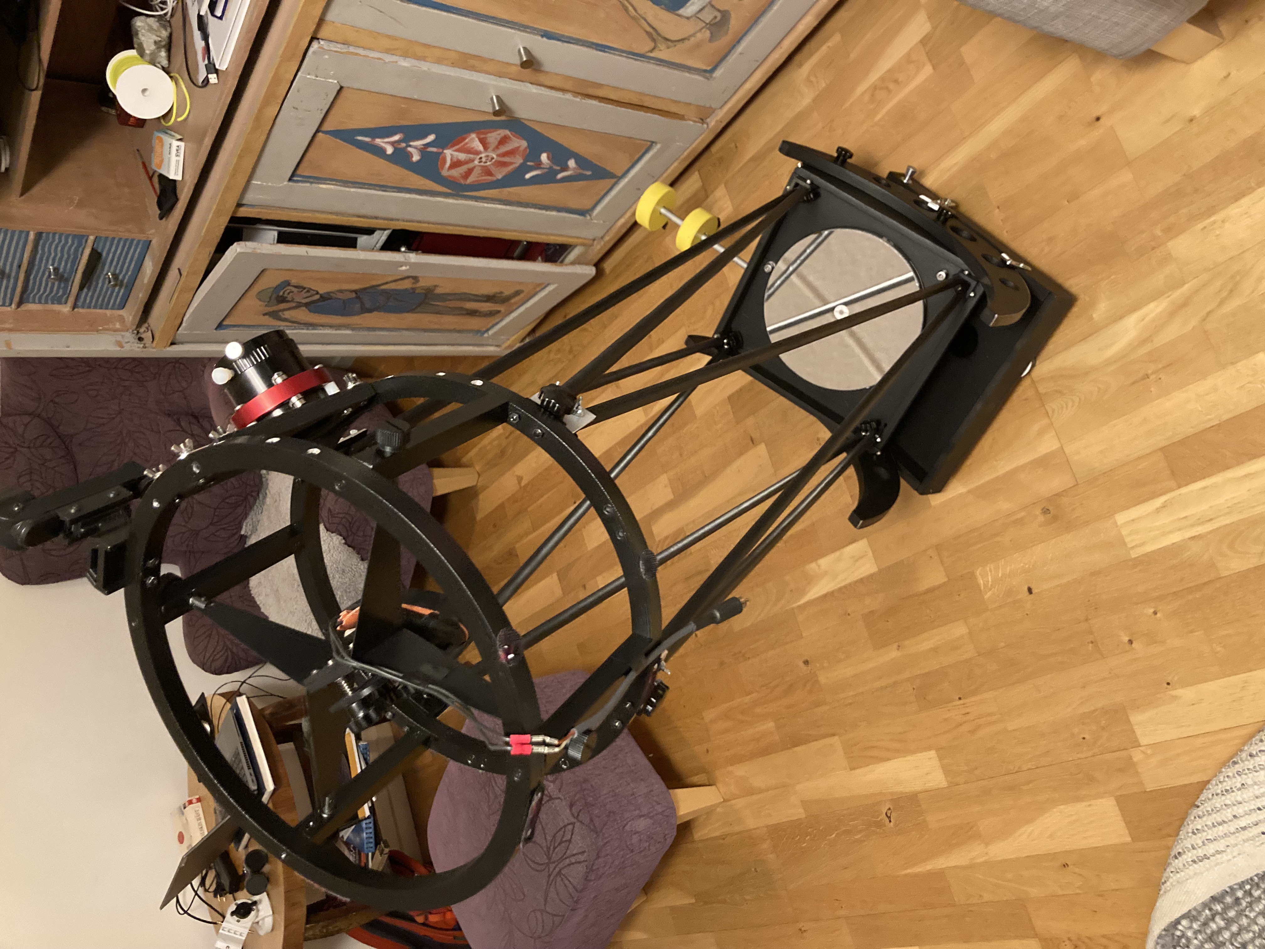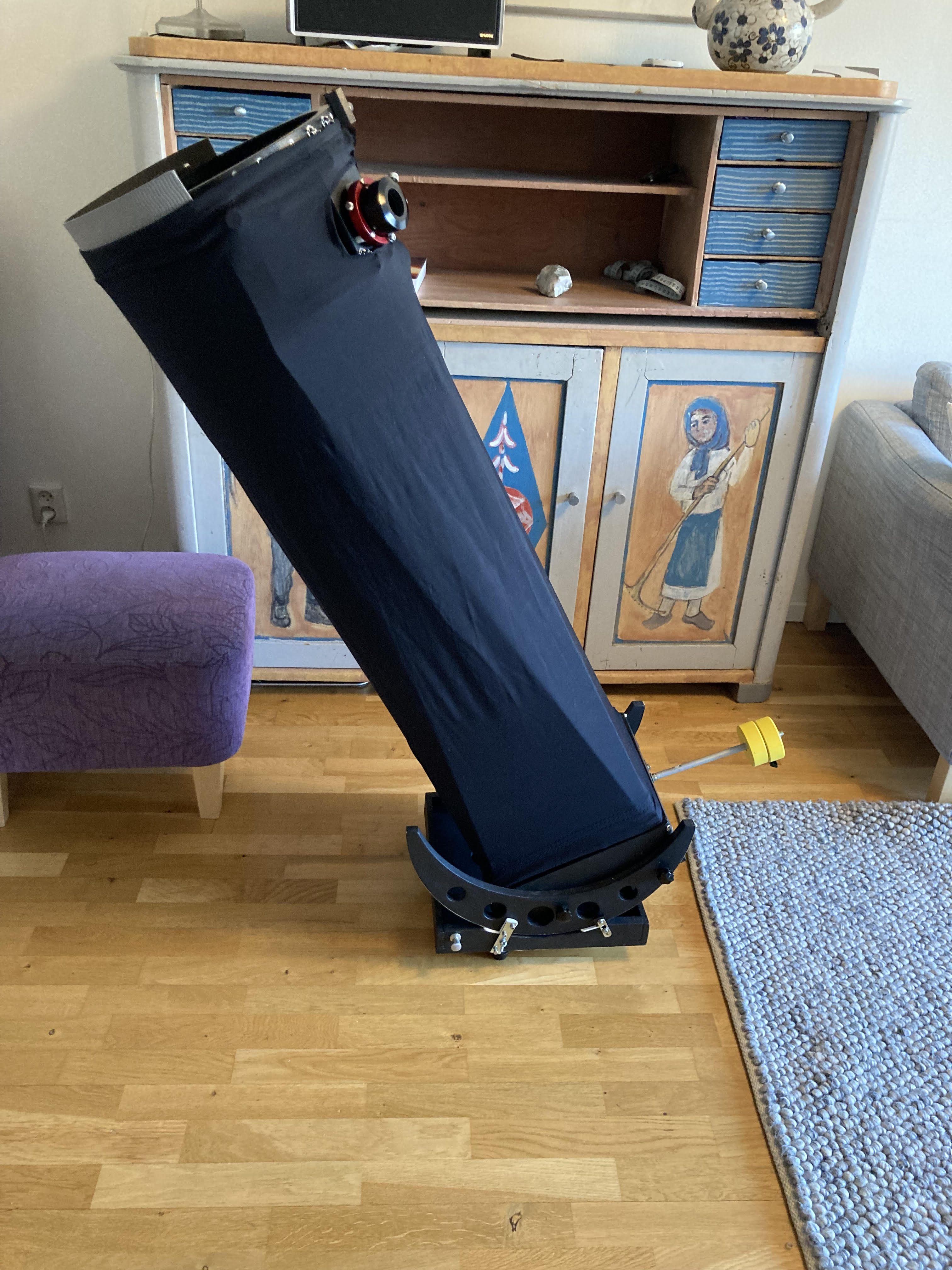 Jag var aldrig riktigt nöjd med mekaniken i den ursprungliga dobben. Den var relativt tung (26,4 kg. Ok, en fjäder jämför med många andra modeller men…), dåligt balanserad (framtung vid låga latituder) och hade ibland ryckig gång (statisk friktion). Optiken är dock helt ok, jag har fått många minnesvärda observationer med teleskopet samt så lär man ju sig att manövrera åbäket allt eftersom. Jag gnuggade stearin på glidytorna för att motverka ryckigheten men det blev ibland mer problem med obalansen vid observationer närmare horisonten, speciellt vid varmare väder (iofs inget jätteproblem i det här landet under obs-säsong