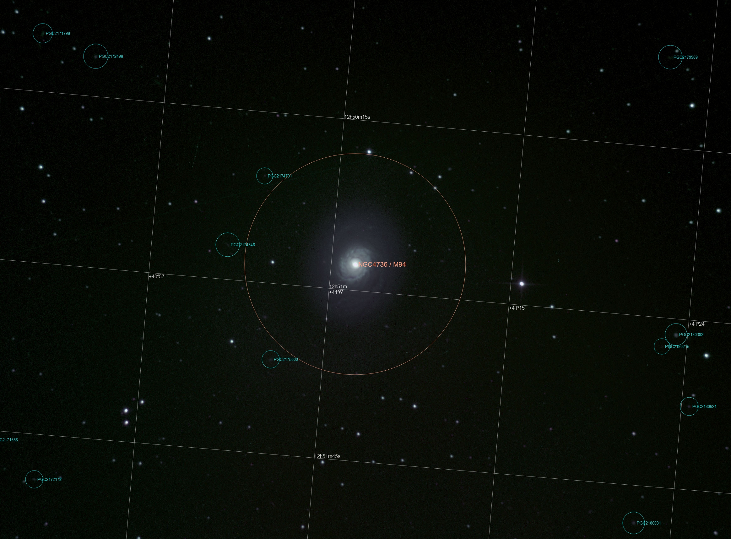 Den ljussvaga avlånga galaxen uppe till vänster om M94 betecknas som SDSS J125009.86+405637.2. g-magnitud 17.7. Identifierade stjärnfältet kring M94 med planetarieprogrammet MegaStar. Noterade att bilden är spegelvänd och roterad 84º moturs från norr. Fick fram koordinaterna 12h50m10s, +40º56'35'. Matade in RA och DEC i NED,