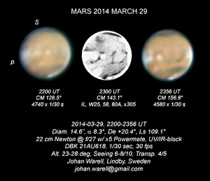 Kommentar: Det var länge sedan jag gjorde en teckning av Mars men här är ett försök från 29 mars, ledsagad av två foton en timme innan och efter. Denna hemisfär på Mars är ungefär lika detaljlös som Stilla havet på jorden, albedoformationerna är mycket kontrastlösa och kontrasten på den inskannade teckningen är ordentligt överdriven. Mare Sirenum vid södra randen, den norra kalotten, de nordligaste albedoformationerna, Tharsis orografiska kvällsmoln och randdis var tydliga, inte heller Nix Olympica var speciellt svårfångad. De flesta detaljer bekräftas också av bilderna, en del avvikelser finns i de diffusa albedoformationerna nära norra polarområdet. Förhållandevis god seeing. För den visuella observationen användes också rött, grönt och ljusblått Wrattenfilter.