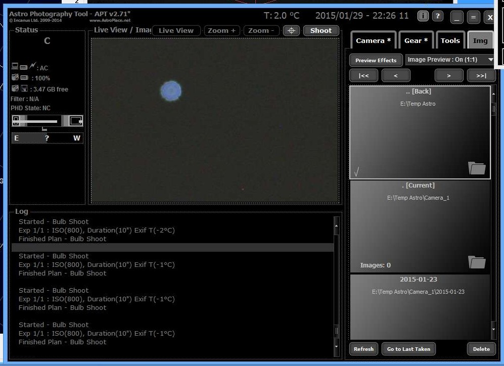 Vincent har fixat buggarna i USB-focus och med de inomhustest jag gjort verkar det ok nu. Ivaylo som utvecklar APT för kamera kontrollen har funnit buggen som gjorde att äldre Canon inte fungerade fullt ut. Nu verkar även den perfekt.