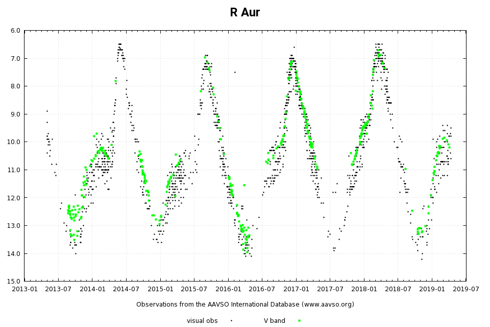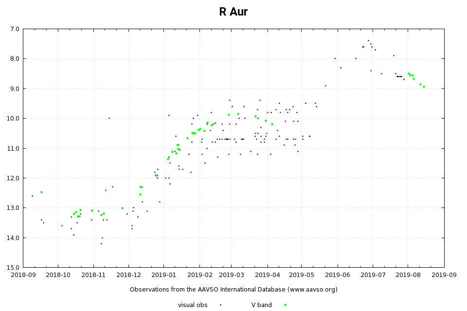 En kort uppdatering om detta. Jag gjorde i maj min sista observation för säsongen av R Aurigae och kunde inte följa utvecklingen med egna observationer. Dock, när man nu tittar på kurvan ser man tydligen humpen som vi anade i våras.