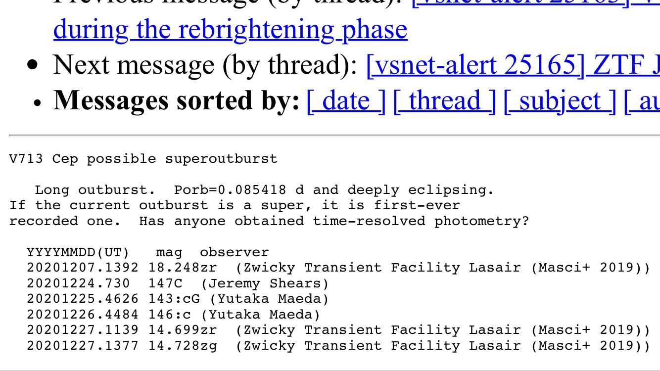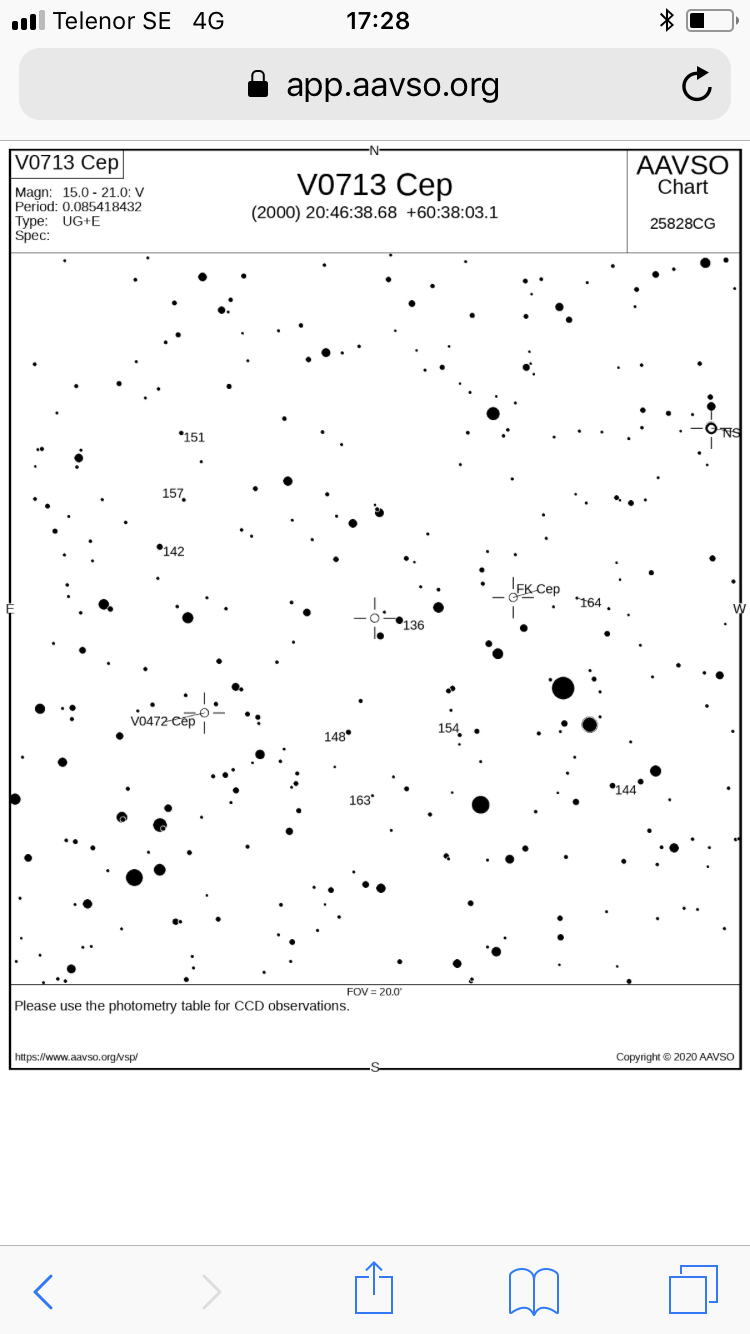 V0713 Cep är en dvärgnova som nu är på tapeten. Den ligger normalt kring magnitud 18, men genomgår mycket djupa förmörkelser ner till magnitud 21 med perioden 123 minuter.