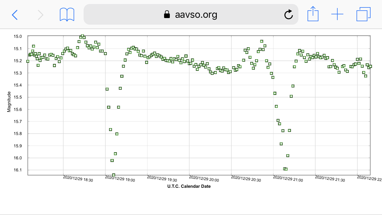 Nu har stjärnan sedan några dygn tillbaka hamnat i utbrott, magnitud ca 15. Vet inte hur det står till med förmörkelserna under utbrottsfasen.