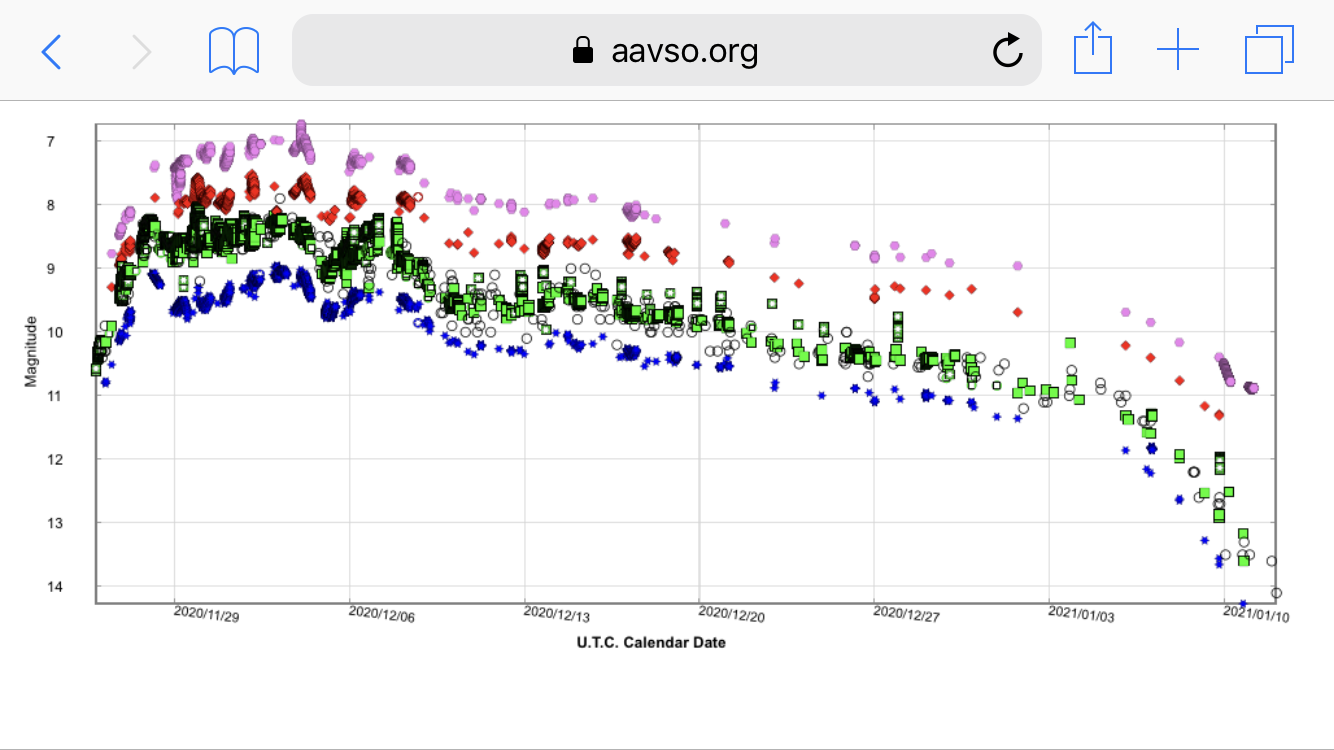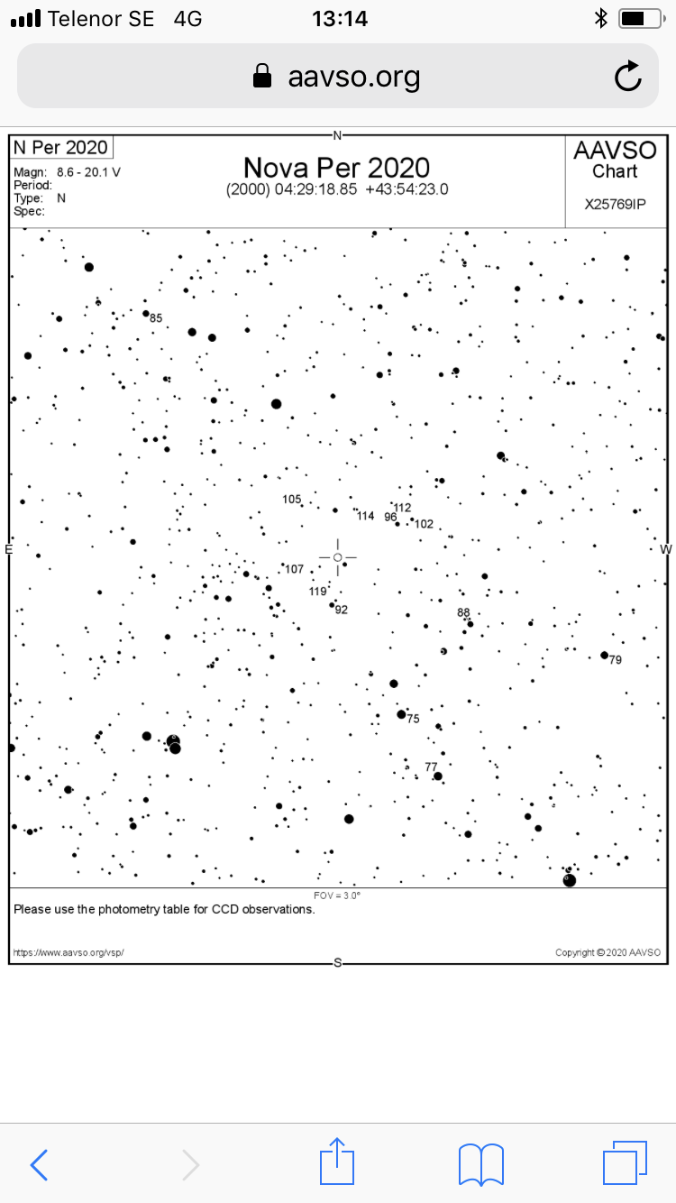 davhei wrote:Observerade just novan och noterade att den var ljusare än stjärnan strax bredvid åt väst, men något svagare än de två starkare stjärnorna i syd och nord. Uppskattar magnituden till 9.5 - 10.0