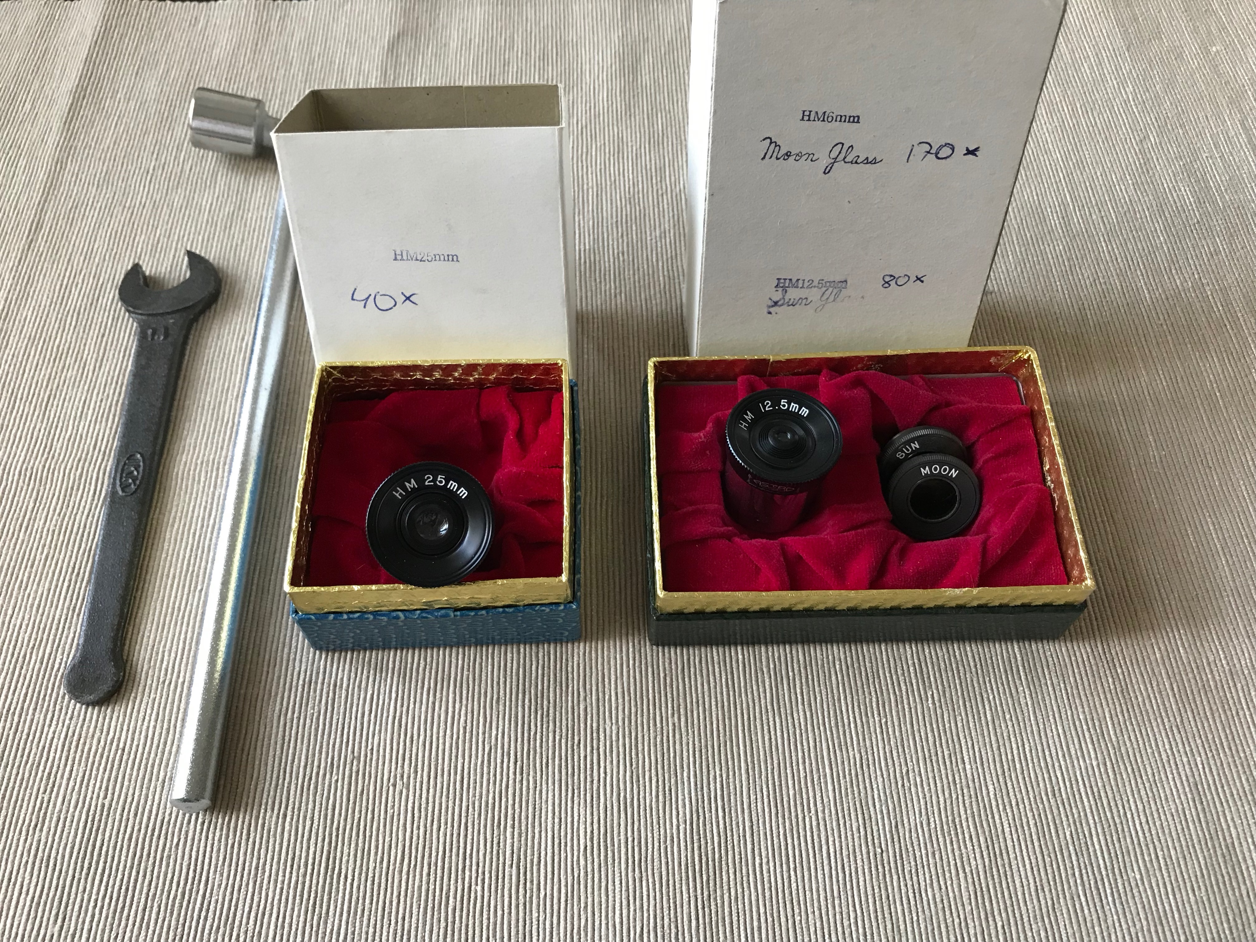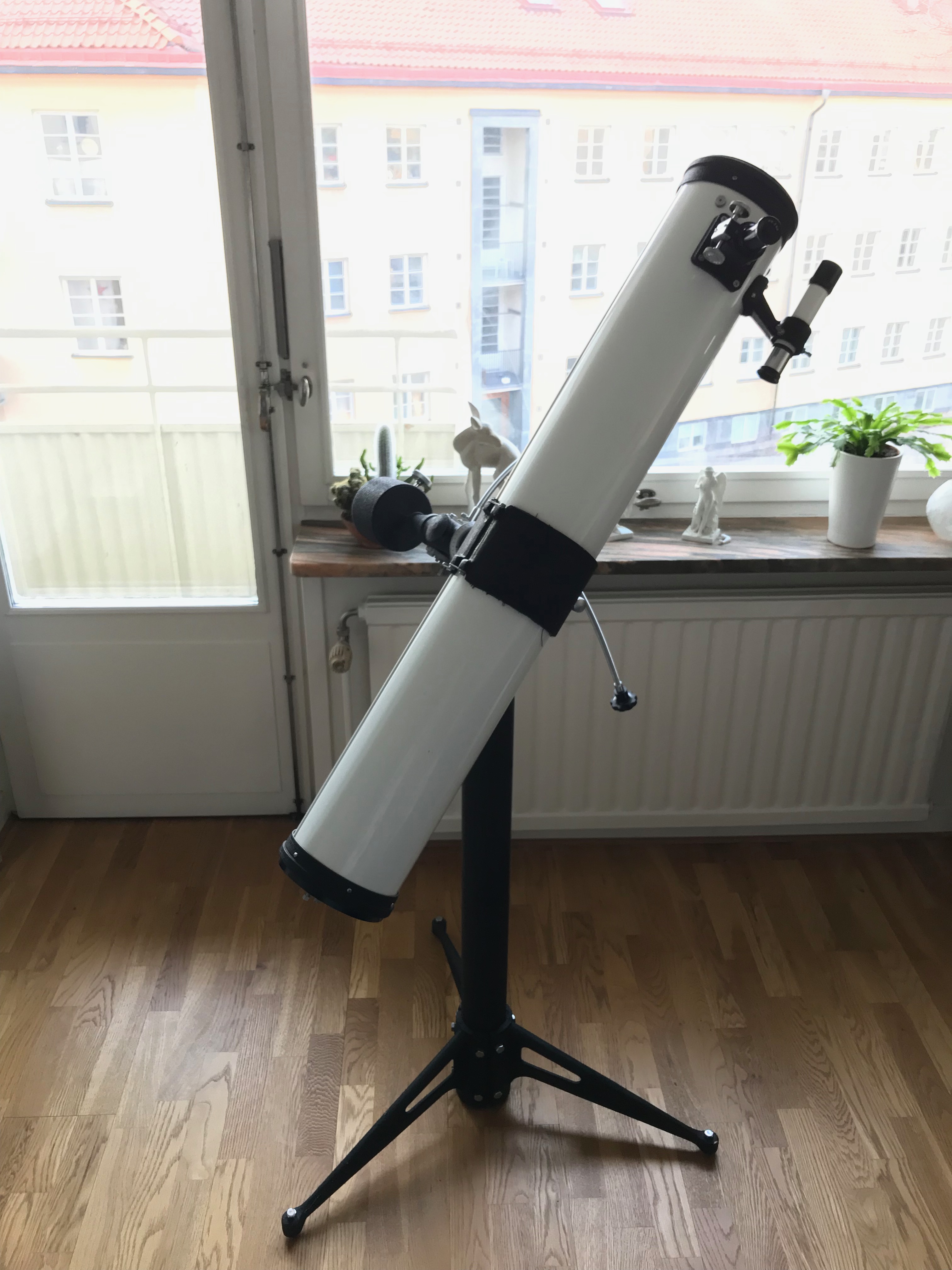 Kul att känna igen själva stativhuvudet som är identiskt med det jag har på min gamla 80 mm refraktor från 1966. Fast jag har mycket gungiga träben i stället för pelaren. Även okularen är mycket tidstypiska...Tvivlar dock på att det finns något större samlarvärde?