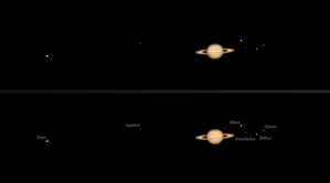 Kommentar: Min Maksutov isade snabbt igen när temperaturen sjönk i natt, så jag tog fram min apo-refraktor som klarade sig bra. Fotograferad med okularprojektion med en Takahashi LE5. Jag har stackat de 30 bästa röda, gröna och blå kanalerna separat i Photoshop och sedan gjort ett montage med månarna.
