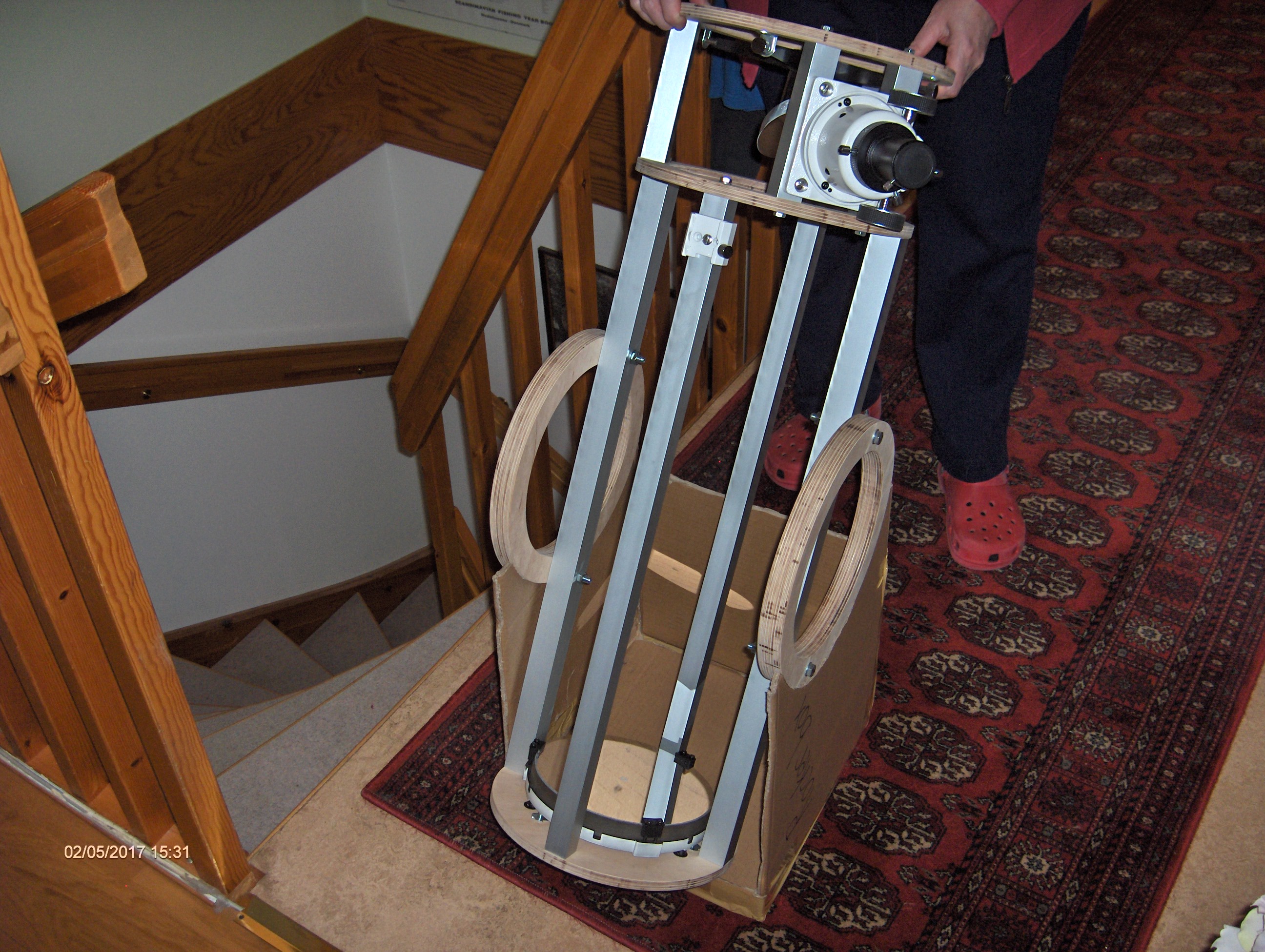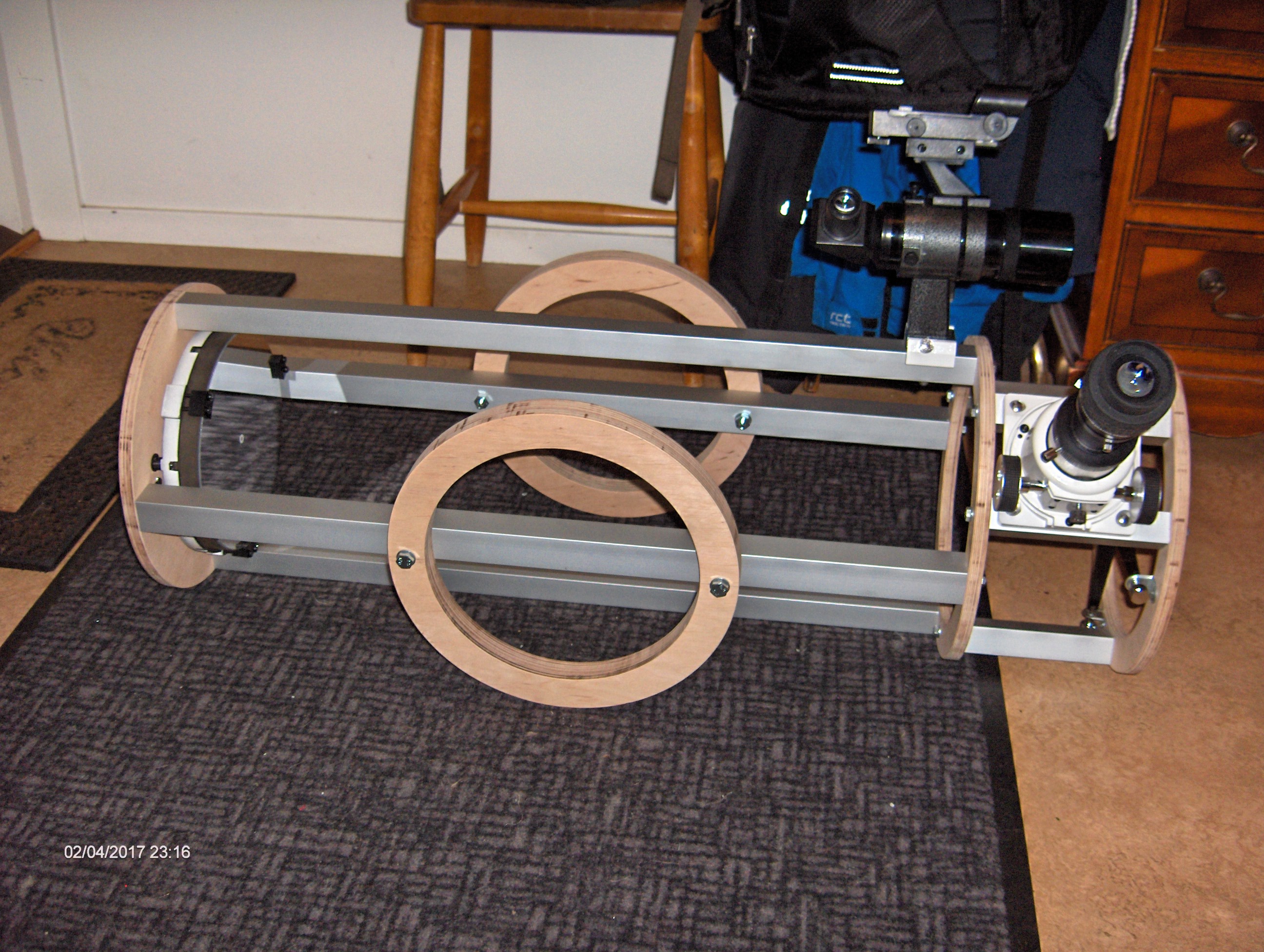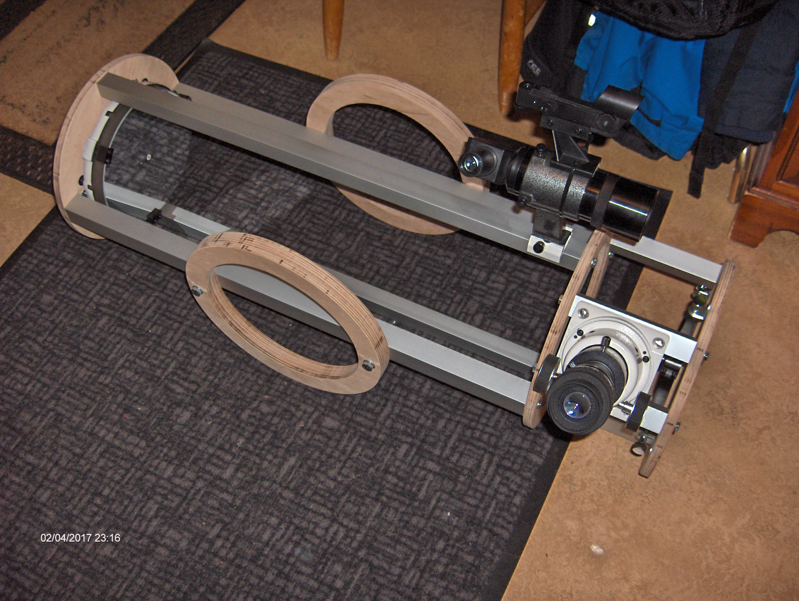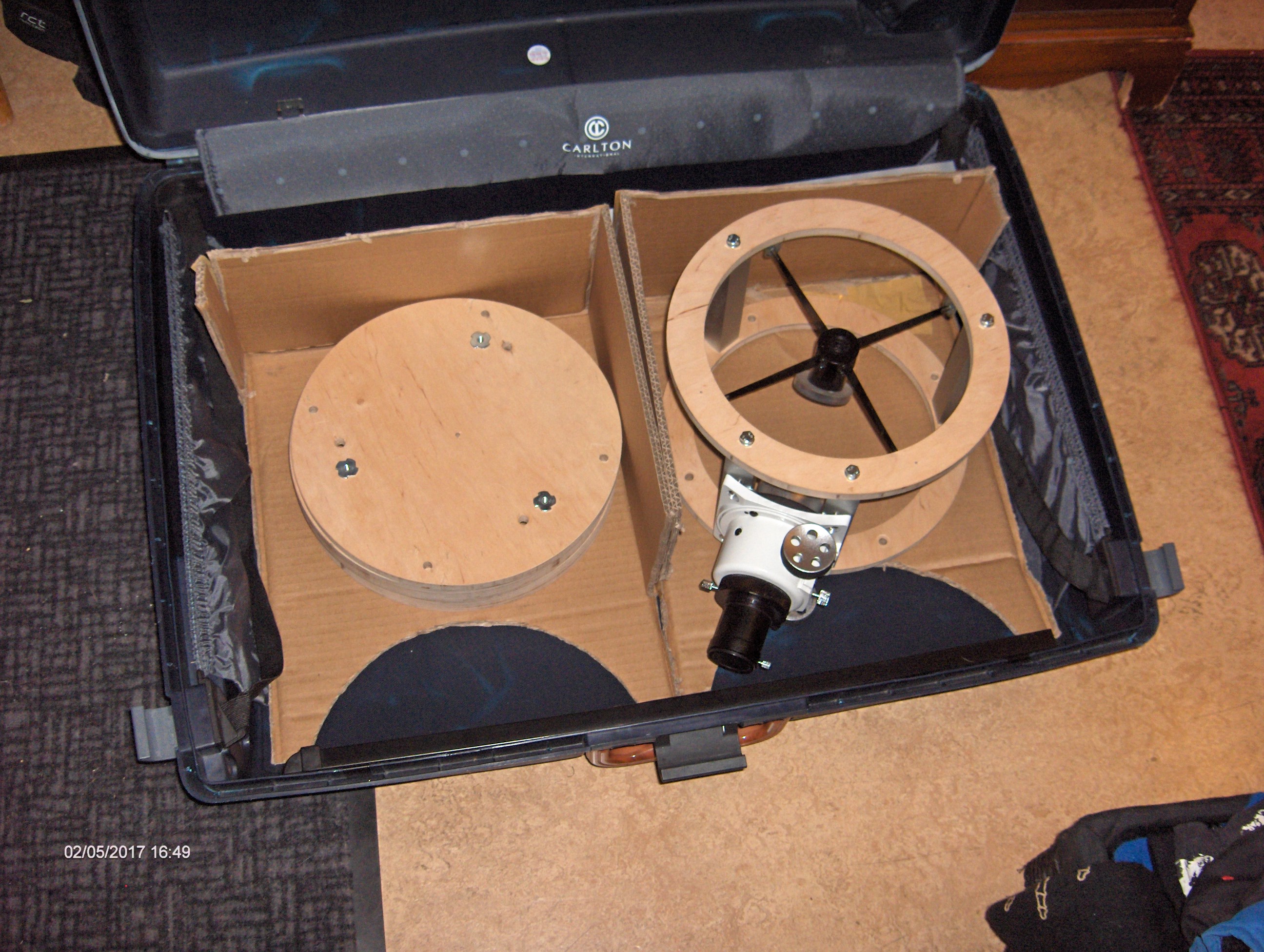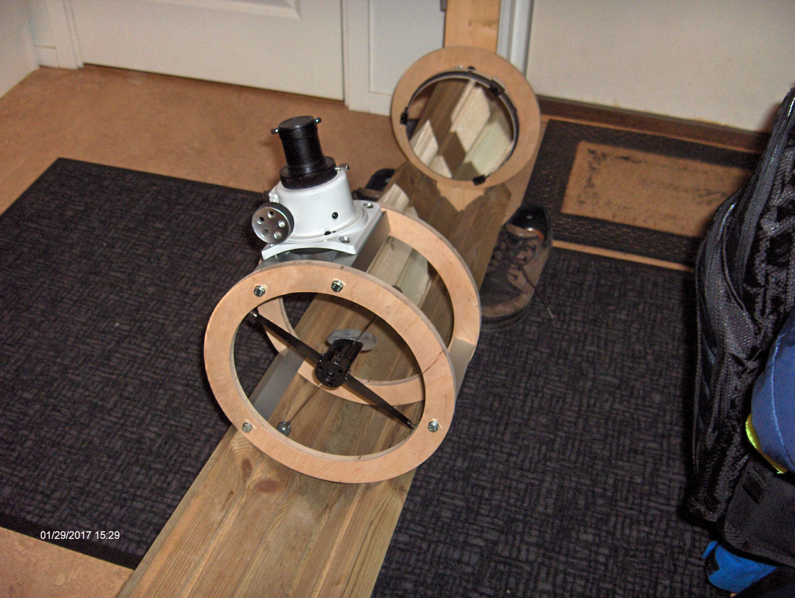 Det gjorde mig genast intresserad och bygget kändes ganska optimalt för mina syften: En 8" resedobson byggd av plywood och aluminiumstag. Isärtagbar och med en möjlighet att plocka ur primärspegeln och transportera den i handbagaget.