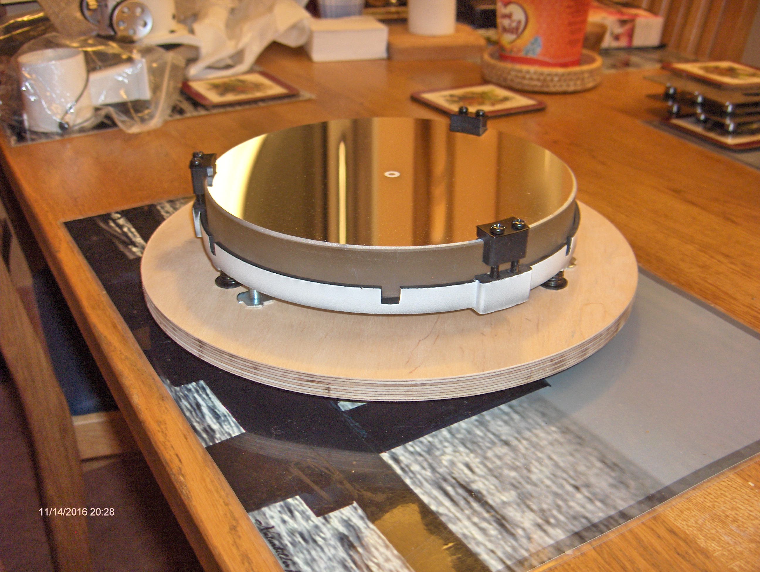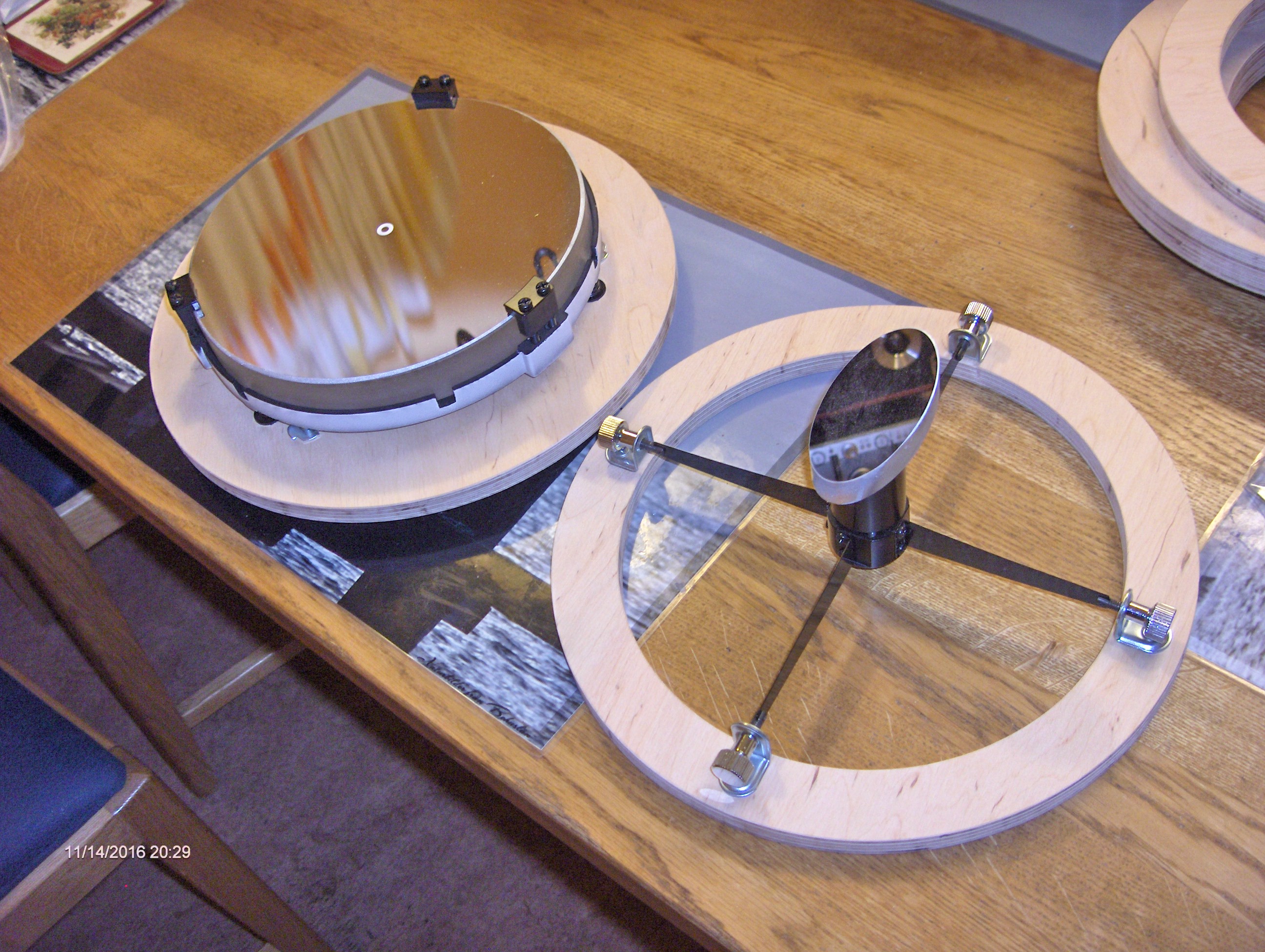Det visade sig redan här bli vissa problem eftersom jag använder en betydligt större och tyngre fokuserare än Gary S så det blev nödvändigt att tillverka ytterligare en plywoodring och göra en konstruktion med en sekundärspegelbur.