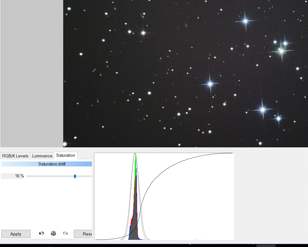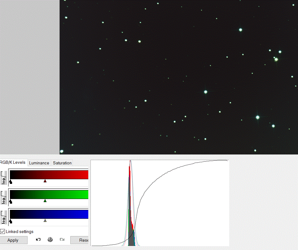 Färgstapeln du ser i histogrammet blir i regel smal. Eftersom bilden mestadels innehåller bakgrund och den skall ju vara lite blåsvart, ungefär lika på alla tre färgkanalerna. Om den blir bred på en sådan här raw bild tyder det mer på problem med ojämn bakgrund, kanske dålig flat kalibrering.