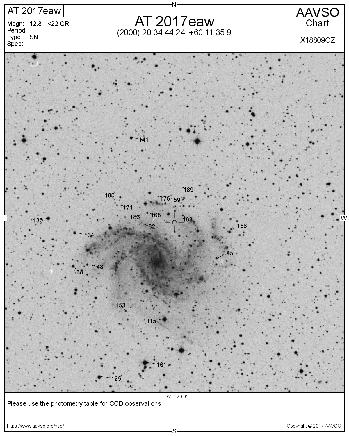 Nedan finns en karta med visuella magnituder för jämförelsestjärnor. Norr är uppåt, utsnittet omfattar 20x20 bågminuter.