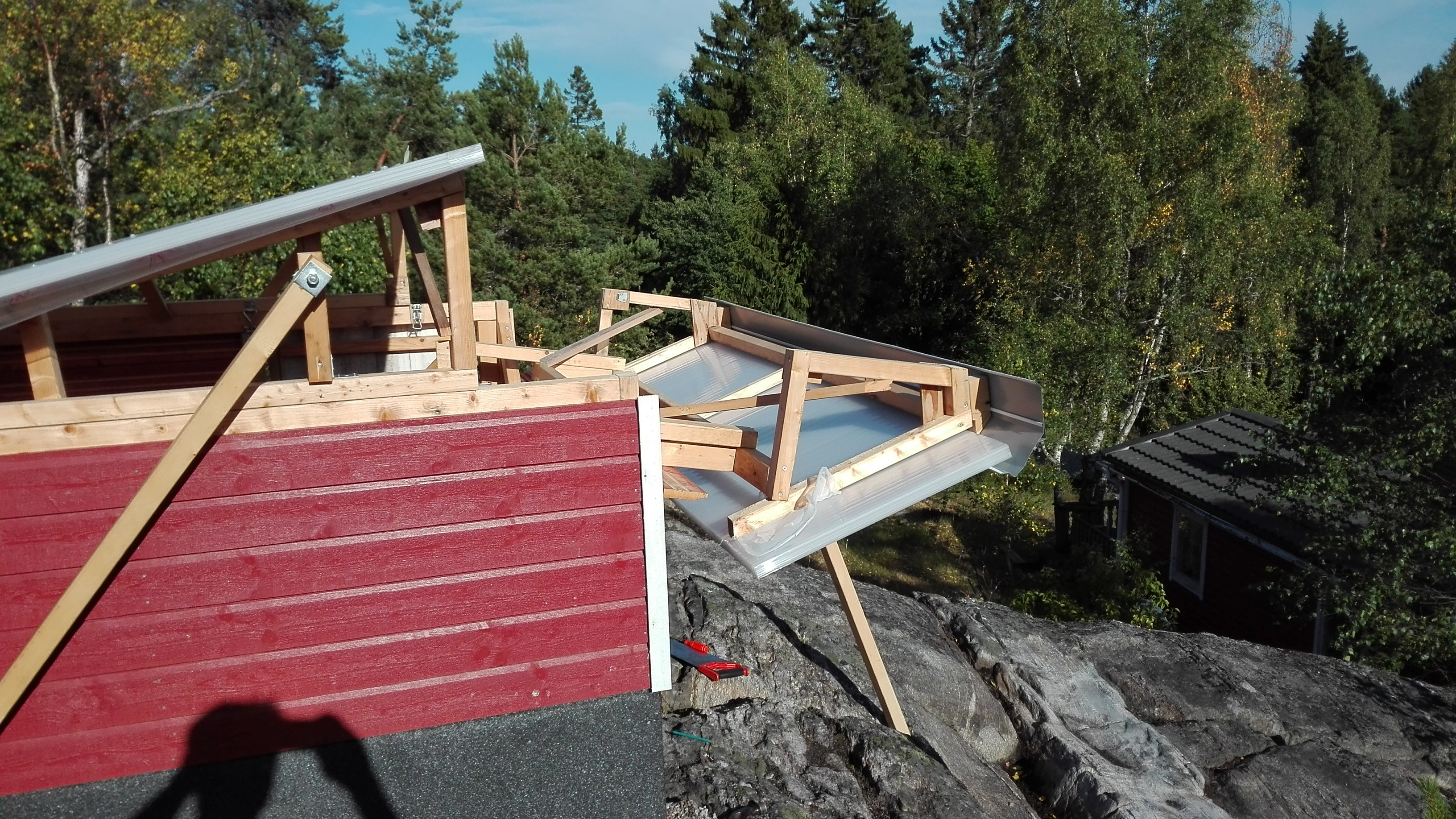 Att jag valde detta tak är för att det är lätt och ganska starkt, därmed enklare regelkonstruktion under. Iden var också med flerlagerskonstruktionen att det skulle minska kondensproblemen, det blir jag snart varse om det fungerar eller inte. Vindfånget bekymrar mig en del, än så länge är inte sidsektionerna monterade så det blåser rakt igenom. Taket är ca 2*2.2 meter. Såg någon beräkning på segelfartyg att varje kvm segel ger 1 hkr. Då har jag ett fyra hkr observatorium :-)