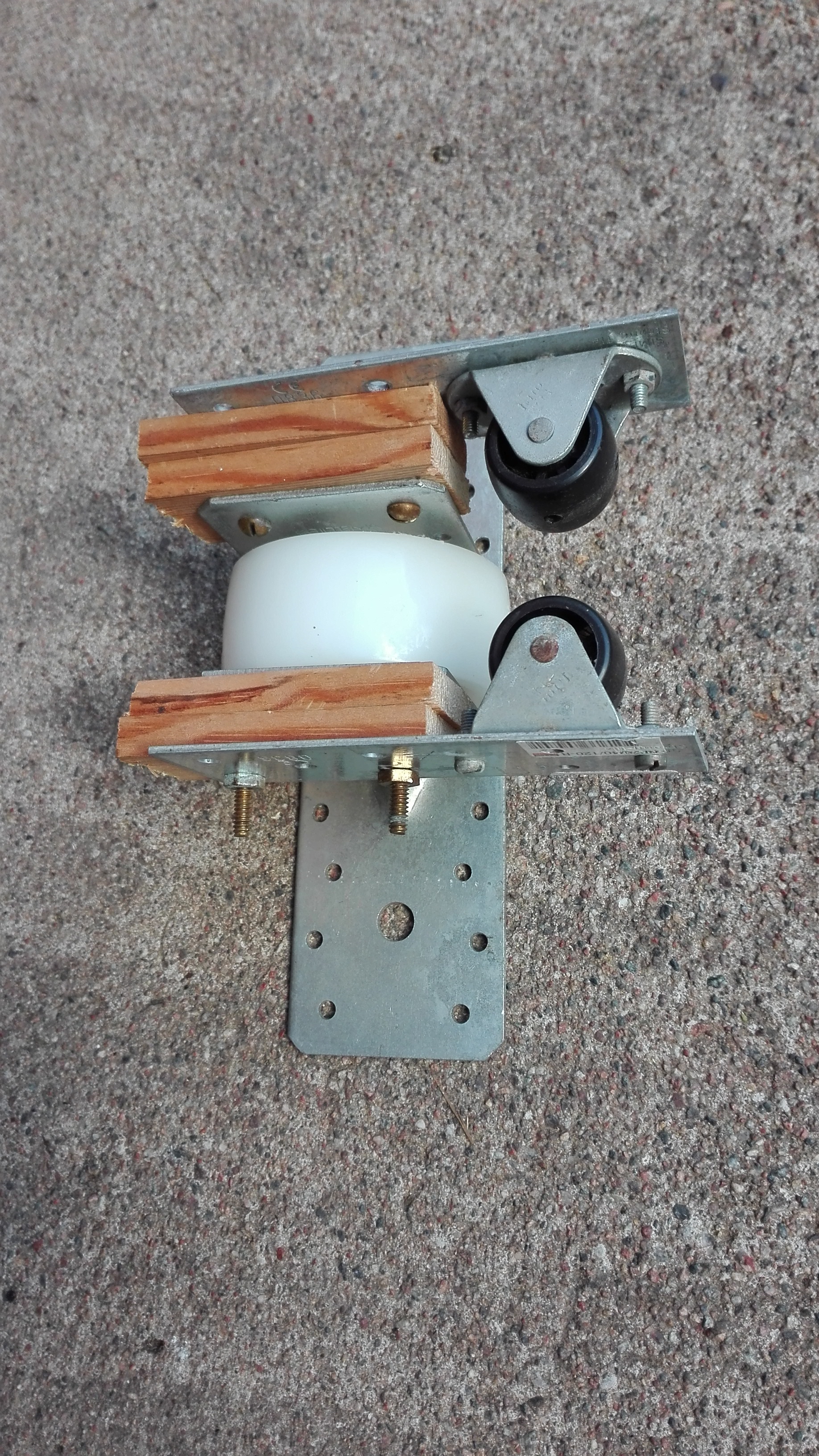 Här syns hjul arregemanget som skall rulla på skenan, ett huvudhjul och två sidstödshjul. Fick bli lite av det som låg i lådorna, stora hjulet kommer från länkhjulet. Sidstödhjulen hamnade ett par cm för högt, får göra ett högre fäste senare för dom.