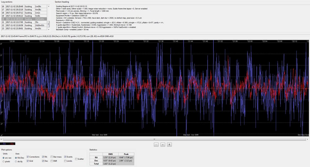 Bilden i inlägget 17:54 ovan visar hur det brukar se ut under guidning med yviga rörelser i RA som där ger en RMS på 1.35” medan DEC ligger på mer beskedliga 0.51” Igår såg det ut såhär med RMS 1.53” respektive 0.57” Allt utan PEC: