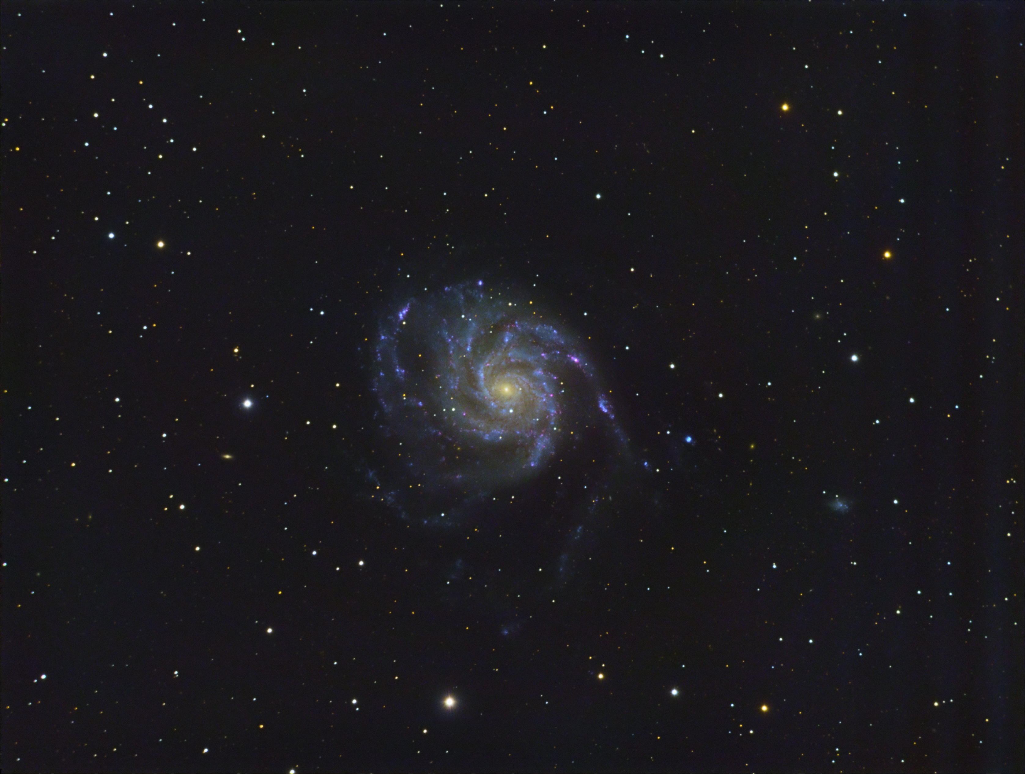Kommentar: Det har vart en stund sedan jag La upp en bild här sist, men det var också då som jag började bygget på mitt remote obs, och det tog helt enkelt upp all tid jag hade, men nu är jag igång igen och vi börjar med en välkänd galax M101 Kombinerat med LRGB+Ha, dock så var jag tvingen att slänga Ha datan då den helt enkelt var för dålig med ett FVHM på runt 7, och som ni kanske ser så var inte ens luminansen så bra, jag hade nog dom sämsta nätterna någonsin när det kommer till FVHM, luminansen blev som bäst på 5.5 och det syns, men då detta var lite mera utav en invigningsbild så gjorde jag ett försök ändå och så fick jag lära om pix insight som jag denna gången gjorde allt i, stackning+redigering.