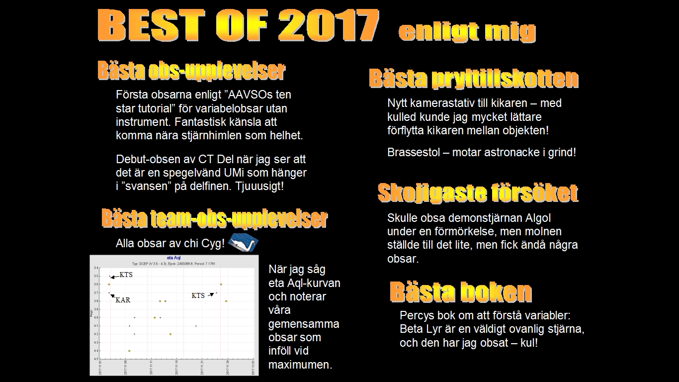Månne det blifva några obsar av chi cyg idag? Såg att ANH och HGG varit i farten. Nu med molniga dagar ser jag tillbaka på november 2017 som i princip är enda månaden jag obsat detta år. Mitt obsande brukar omges av längre pauser, får se hur aktivt det blir det närmaste. Höstarna gillar jag bäst för då är det mörkt så tidigt. Liten sammanfattning (varning för vissa upprepningar :D ) :