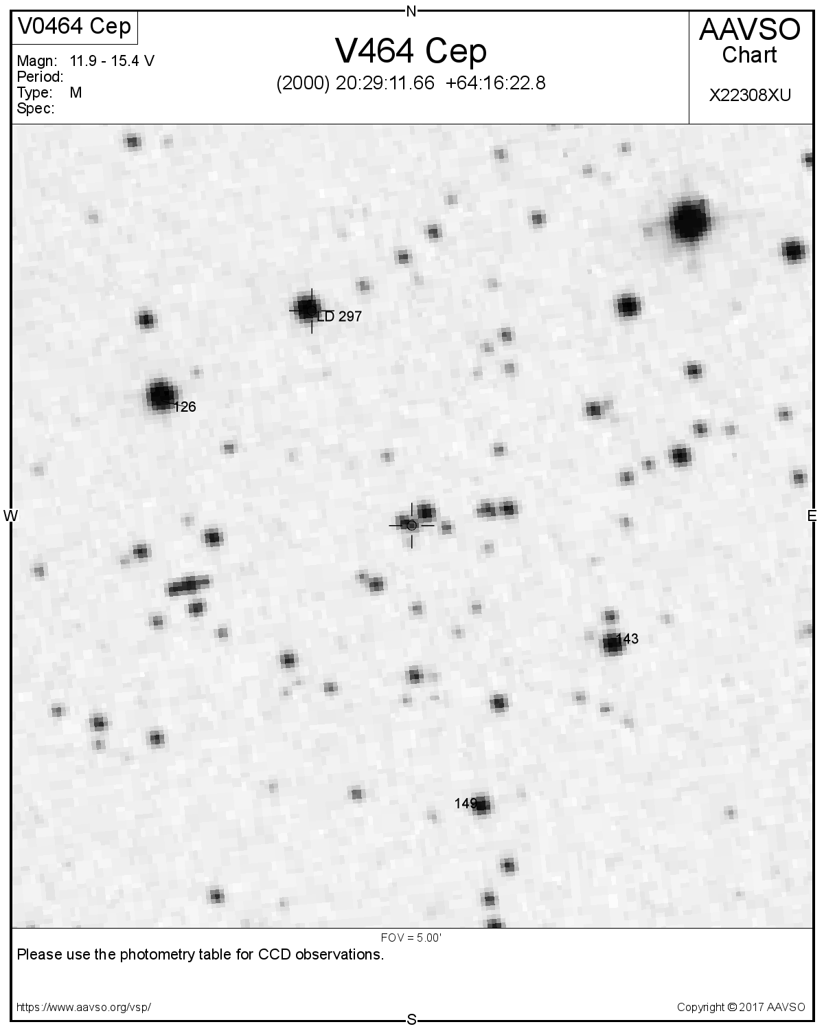 Bilden nedan är från VSP och omfattar 5x5 bågminuter, med norr uppåt och öster åt höger (dvs spegelvänd). Man ser där kompanjonen alldeles till vänster om V464 Cep.