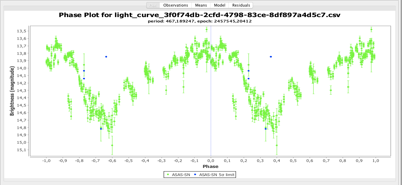 Analys av mätningarna från ASAS-SN (med metoden DC DFT i Vstar) ger en period på 467 dygn. Här är en fasplott med elementen 2457545.2 + 467.2 * E