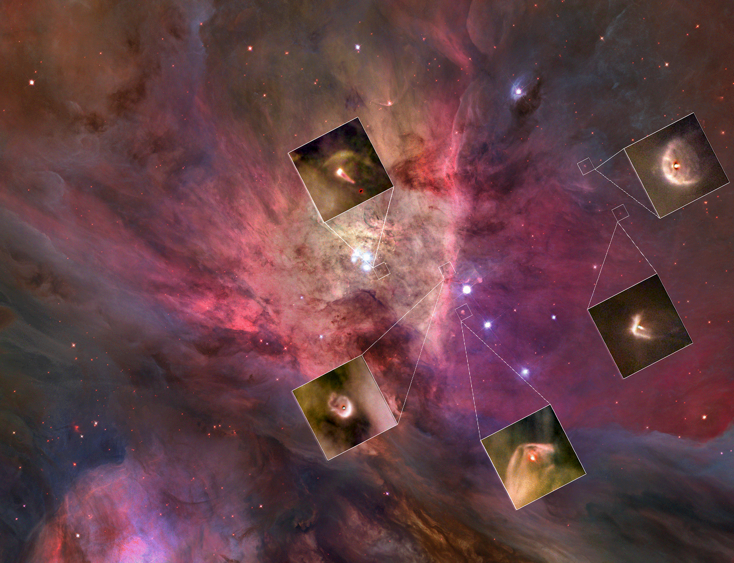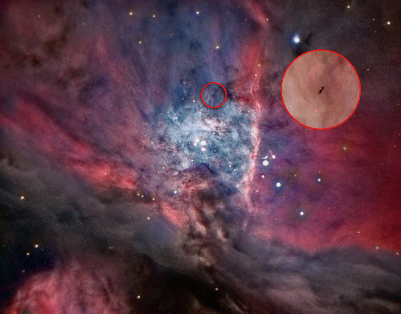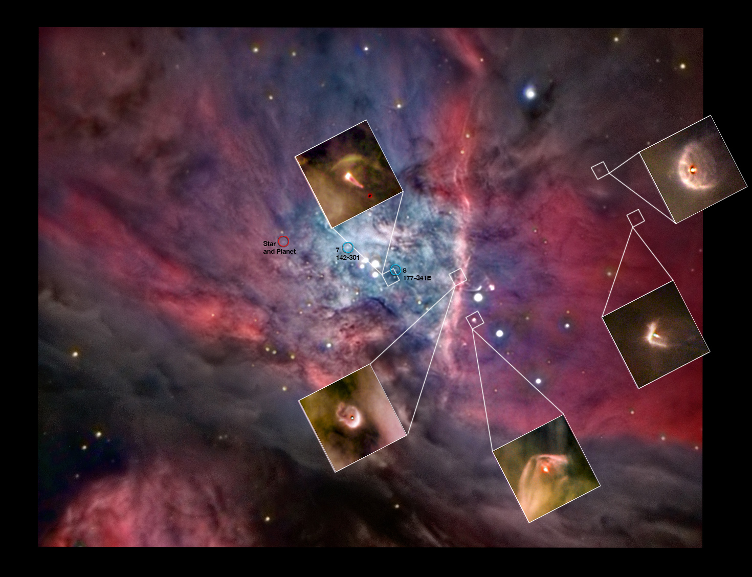 För 3 veckor sedan dök den här rapporten upp https://www.nasa.gov/feature/goddard/20 ... ion-nebula" onclick="window.open(this.href);return false; . Den röda ringen till höger i Hubblebilden i länken visar en stjärna med en planet och den syns även som en liten diffus ljusfläck i vår bild, även markerad i rött. I de blåa ringarna syns ytterligare 2 proplyder som vi har identifierat i våran bild och som jag har numrerat 7 och 8 följt av NASAs identifikationsbeteckning.