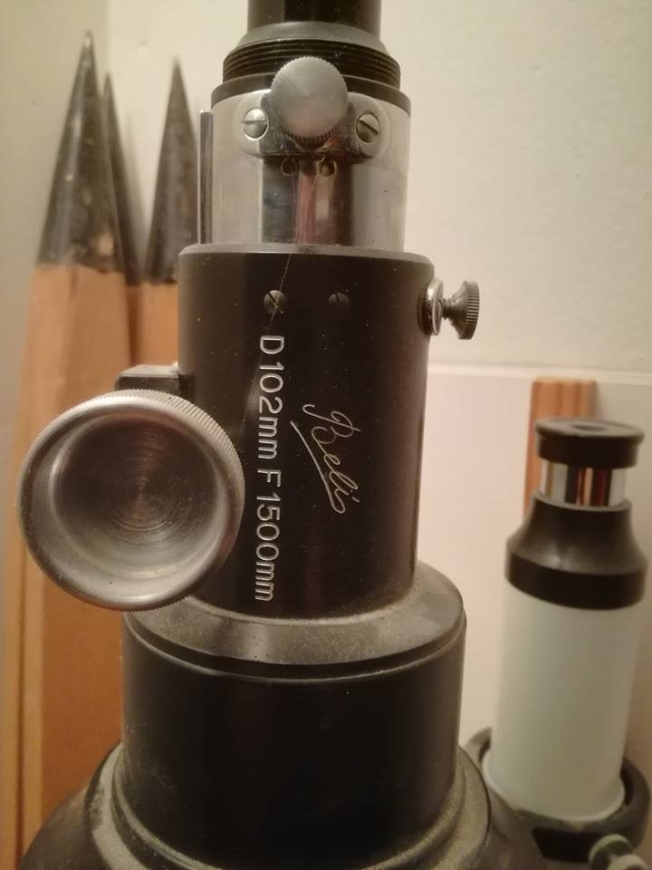 Hade själv en fågeltub med Beli namnet! Unitron såldes under många namn. Polarex känner de flesta till, men Weltblick? Såldes som blåa varianter i Tyskland! Här i Sverige är nog Björn Hedvalls "Meridian" kändast! Köpte man ett på Clas Ohlson på 50/60-tal kunde det stå bl.a. "Jupiter" på dem, men alla är Unitron! Så även denna 4" refraktor. Fokuseringen tror jag hette de lux! Var ett mellanting mellan den som satt på 60 o 75 mm teleskopen och "Super" fokuseraren som satt på 5" , 6" och Photoequatorial 4" refraktorerna. De tre "hornen på objektivcellen är kollimineringen. Har aldrig varit med om att skruvat på dessa! Modellen ser ut att vara från en bit in på 60-talet! På bilden syns huvudet utan ben adaptern! Finns den? Svårt att montera benen annars. Skall dessutom vara en liten skruv i den, som hindrar att det lossnar!