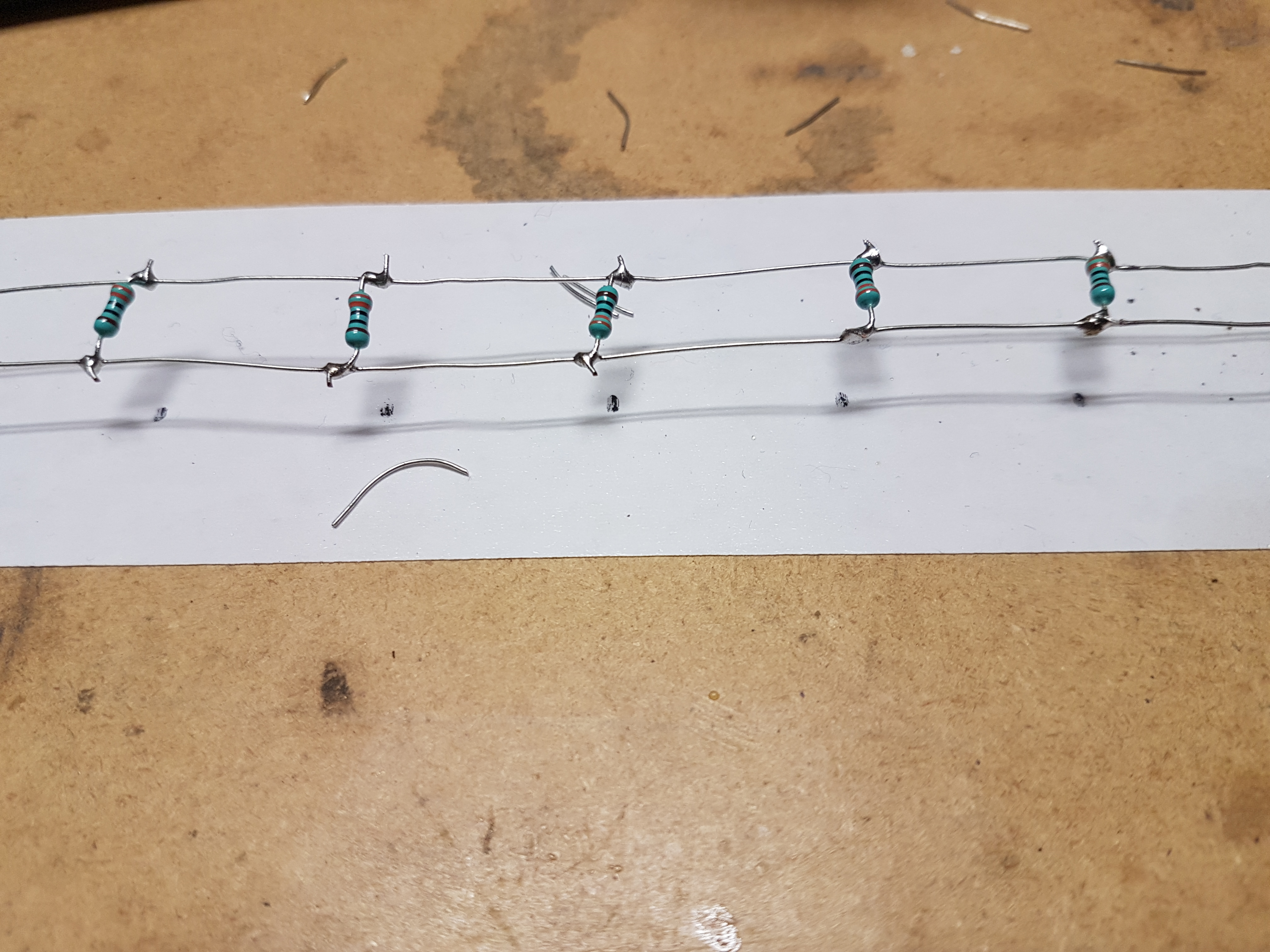Sen sträckte jag upp 2 trådar på skruvar så det skulle bli enklare att tvinna fast och löda motståndena.