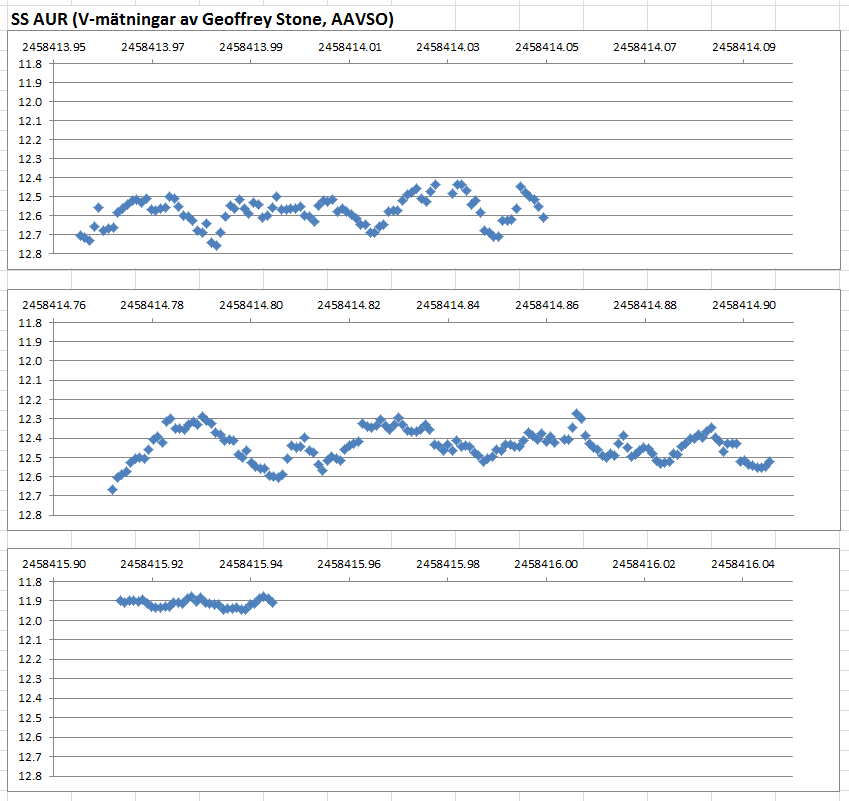 Nedan visas tre intressanta mätserier (V) som nyligen utförts av Geoffrey Stone, AAVSO. De tre diagrammen har samma magnitudskala, och omfattar lika lång tid för att man enklare ska kunna jämföra.