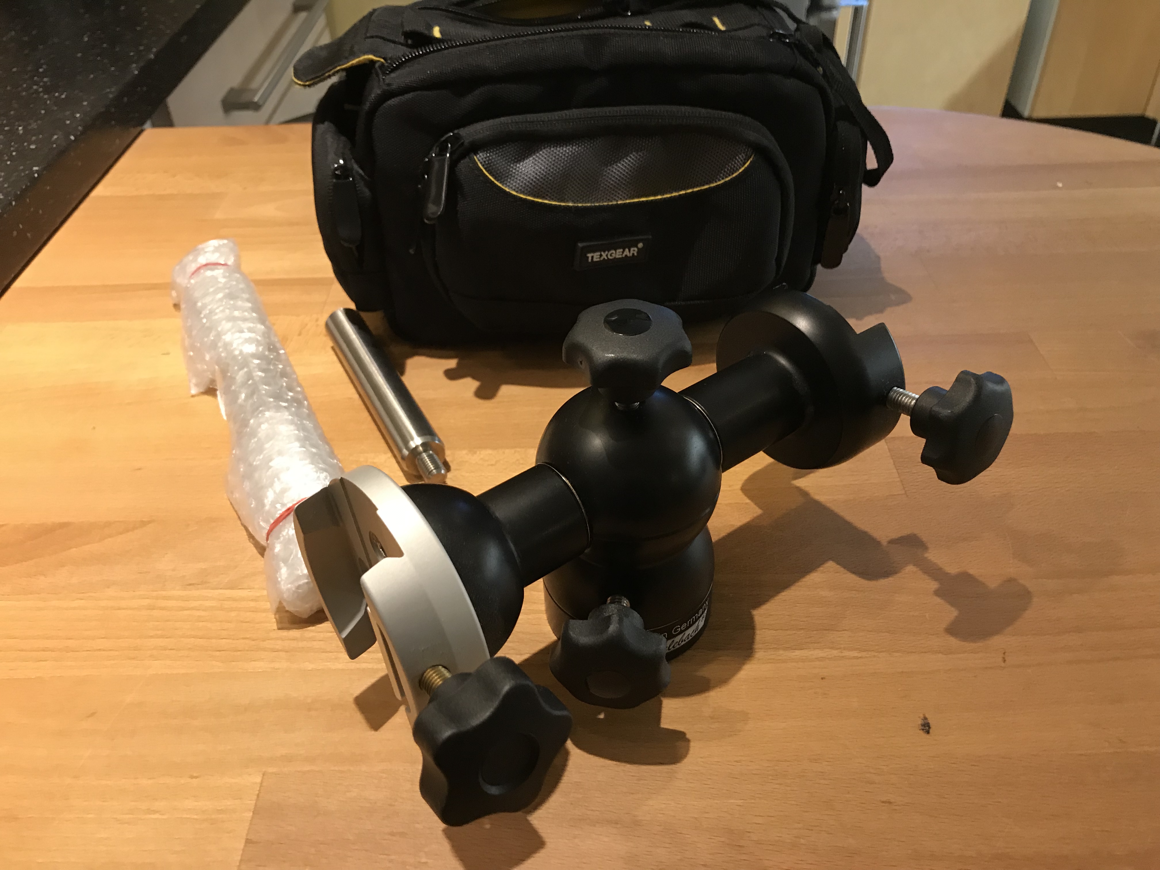 Berlebach Alt Azimutal huvud helt metall. 2st motviktstänger av olika längd samt 2st vixenklämmor för dubbelmontage av teleskop. Motviktstängerna kan monteras istället för vixenklämman på någon av sidorna vi montering av tyngre teleskop. 3/8 gänga för montering på större kamera stativ. Mycket bra skick