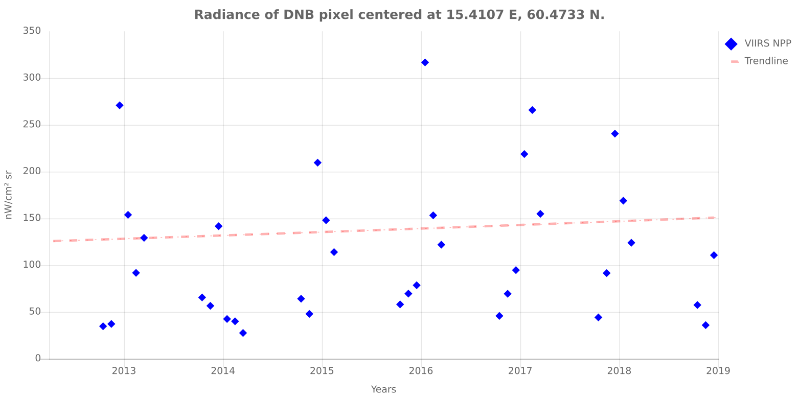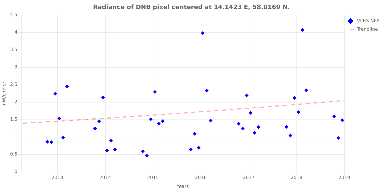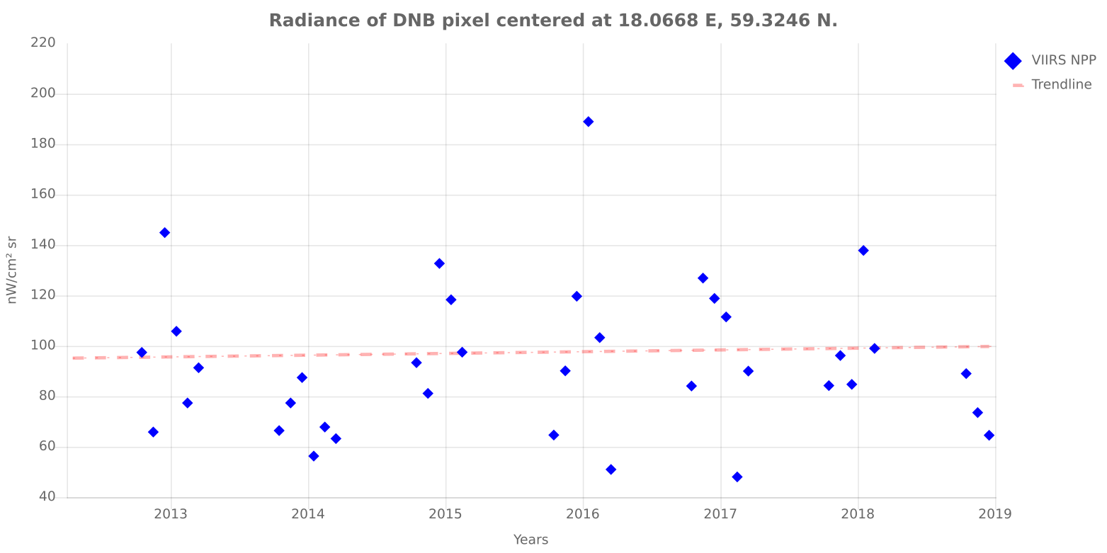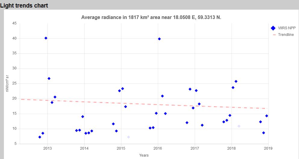 Nedan finns trenden för stället i Småland där jag växte upp. Lite andra nivåer på ljusföroreningen jämfört med Stockholm ...