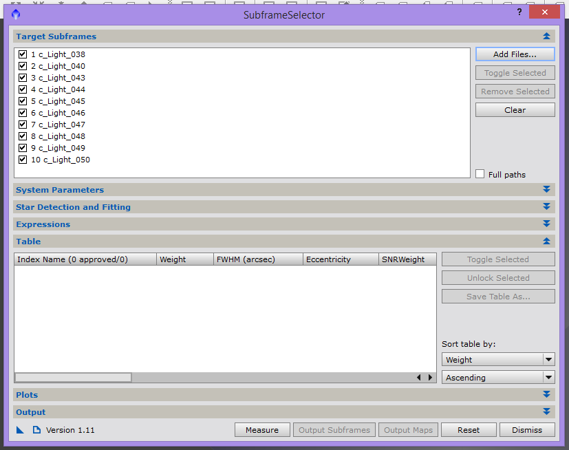 Ladda de kalibrerade bilder i skriptet SubFrameSelector. Det finns under menyn Scripts | Batch Processing.